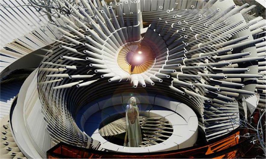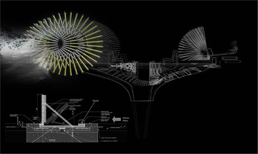 落潮時(shí)的建筑結(jié)構(gòu)建筑外部半圓形的聚合層設(shè)有太陽(yáng)能電池,為生活區(qū)域供應(yīng)電力。建筑橫截面是由一組水力機(jī)組成,可以利用潮汐不斷的提供可持續(xù)能源。水的運(yùn)動(dòng)比太陽(yáng)能和風(fēng)能更可預(yù)測(cè),因此找到一個(gè)合適的位置的運(yùn)用潮汐發(fā)電技術(shù)相對(duì)更容易。