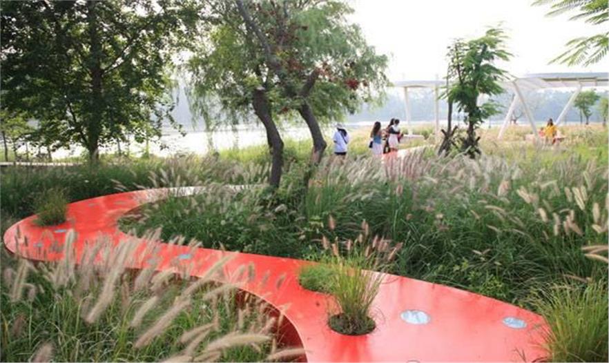 自從2008年完工以來,這個20公頃的綠色區(qū)域取代了之前難接近的河岸,而且在不危及環(huán)境保護的情況下能讓不斷增長的人口使用。這個紅飄帶是項目成功的關(guān)鍵部分,因為它是項目的“脊柱”,為空間提供結(jié)構(gòu)框架,也參考了關(guān)于中國流傳的能源流動的神話故事,讓人們通過他們的文化傳統(tǒng)來辨識環(huán)境。