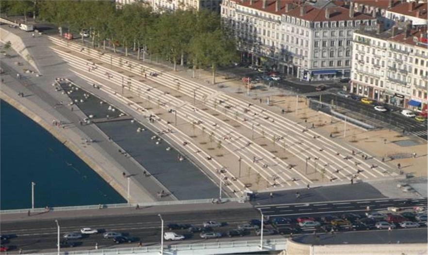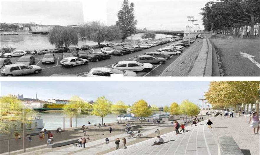 當羅納河岸改善設(shè)計競賽的獲獎項目于2007年完工時,這個10公頃的區(qū)域給里昂人們提供了一個用于休閑娛樂的線性空間。河流的東面之前是用于停車場,現(xiàn)在成為一個動態(tài)空間,建造了人行道和自行車道,促進人們進行運動,提升可持續(xù)性交通。