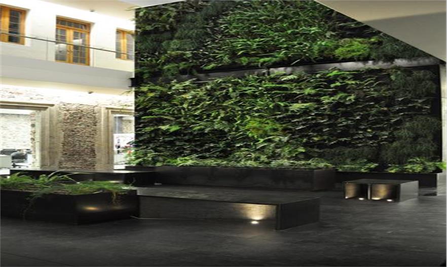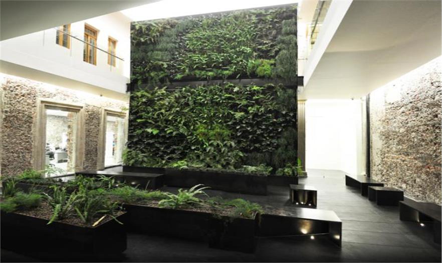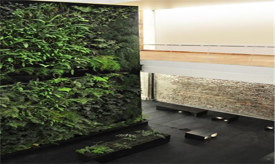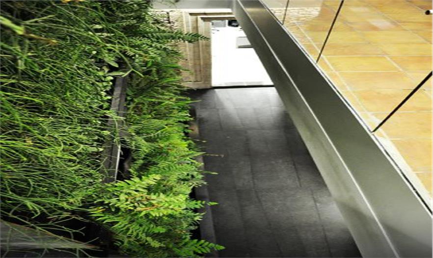 這個設(shè)計的概念是把這個水平花園“翻轉(zhuǎn)”成“垂直花園”。因為這個庭院是2層高,所以這個“垂直花園”大概有12米高,能給上面的用戶一個綠色景觀。下面的“硬”地板是由花崗巖建造,為了給人一種游玩和自由的感覺,地板的設(shè)計有微小的變化。