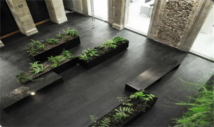 花盆和長凳都是遵循一種原則設(shè)計的。長凳是“粗糙制成”的鋼鐵板彎曲制成的,采用了地板設(shè)計中同樣的幾何圖形。所有的長凳和花盆有不同的尺寸,可以輕易地移動,加強個性和自由性的概念。