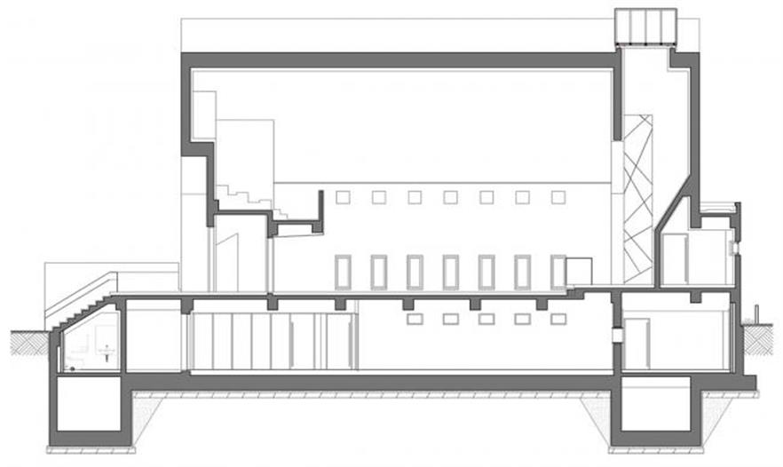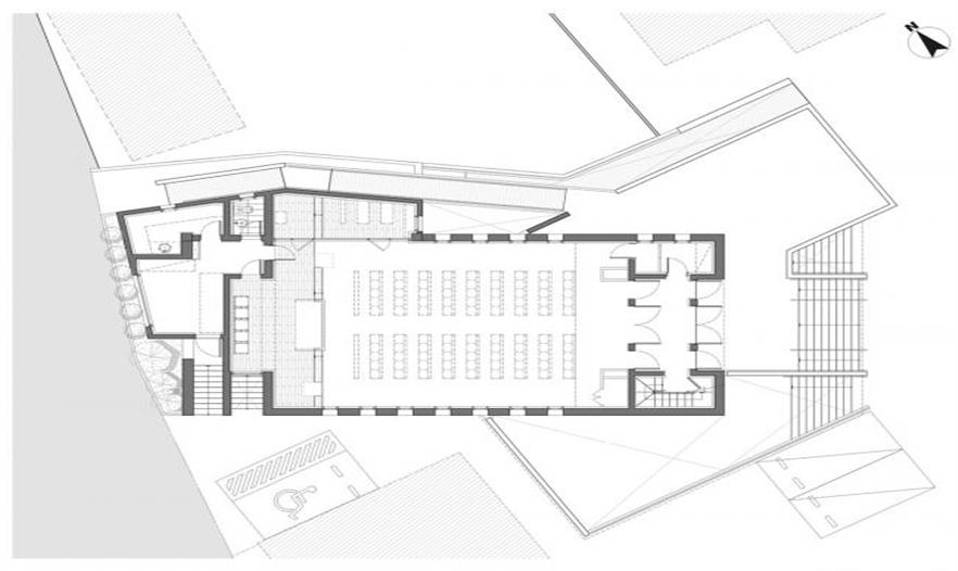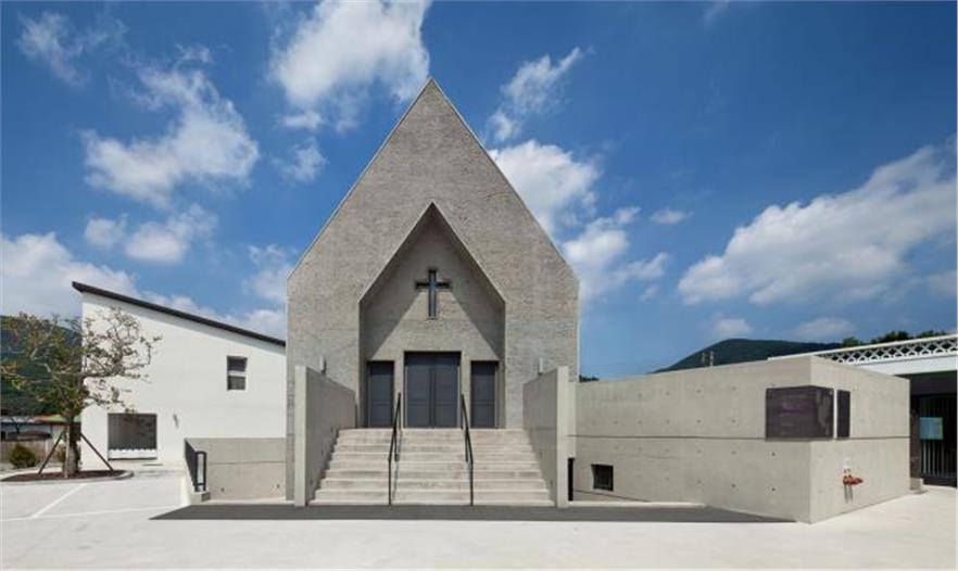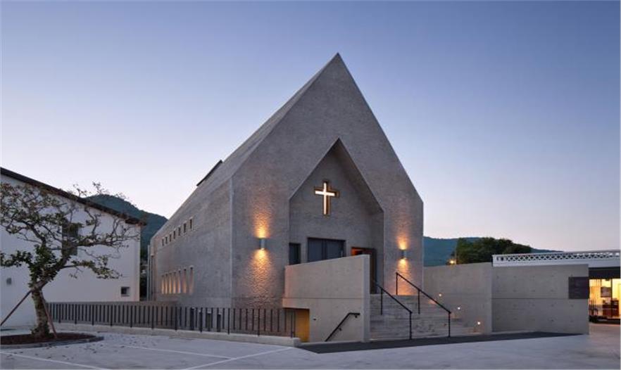 高比例的教區(qū)、空間需求和有限的預(yù)算是決定建筑形式、空間布局和材料的關(guān)鍵點(diǎn)??紤]到樓梯的使用者是老年人,教堂部分比院子高了半層,而大廳、教室和廁所布置在下半層。外墻和教堂的屋頂是碎裂的混凝土結(jié)構(gòu),給人以粗糙巖石的感覺(jué)。