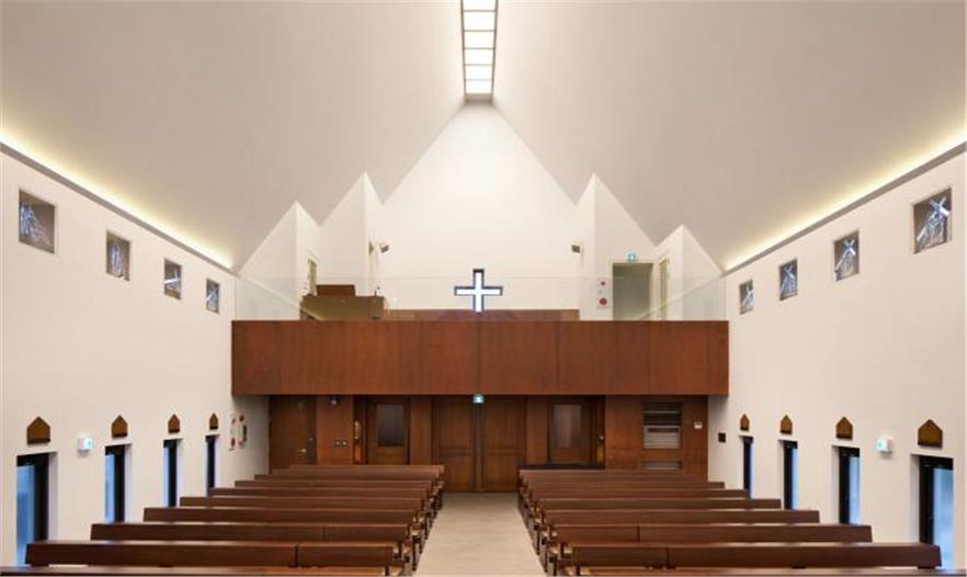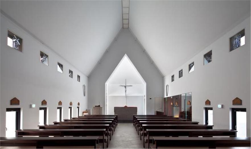 由于預(yù)算的原因,空間形式雖然簡(jiǎn)單卻顯示出適度的裝飾和材料,但是這種看似不起眼的簡(jiǎn)易性依然像其他宗教建筑一樣表達(dá)了永恒。在通過(guò)入口的一剎那,為了禱告而設(shè)計(jì)的神圣空間立刻在白色明亮空間里顯現(xiàn)。教堂的空間布局符合早期的教堂建筑形式。唱詩(shī)班閣樓位置和入口的設(shè)計(jì)來(lái)源于哥特式教堂。