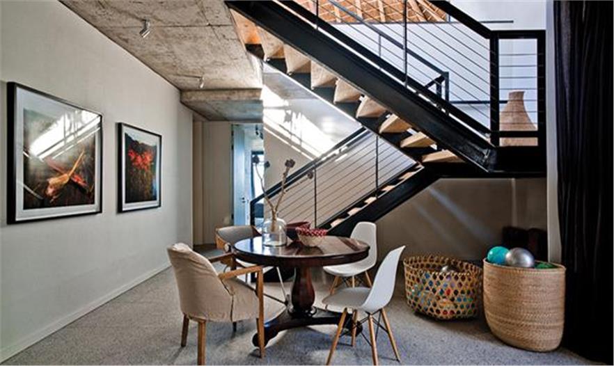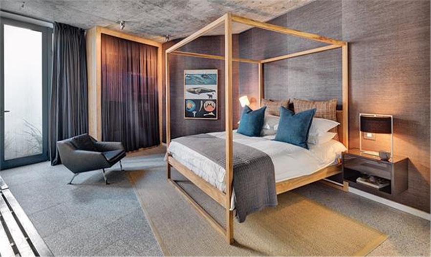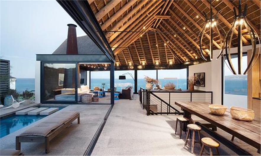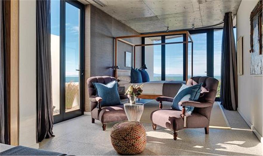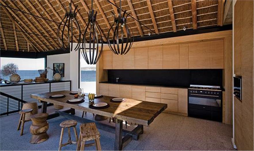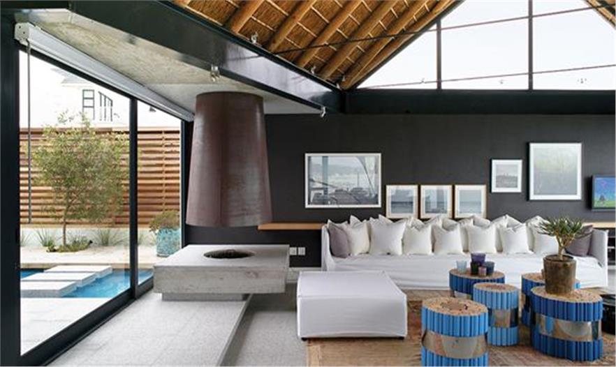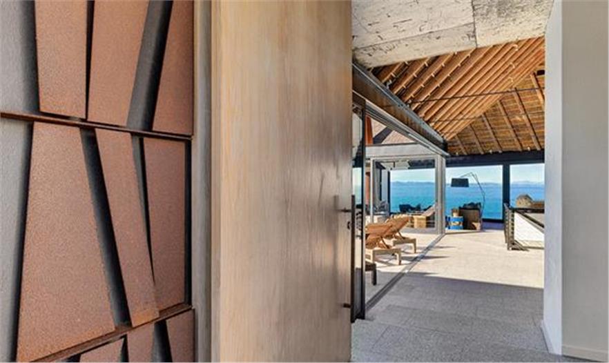 地面層的方形泳池庭院讓建筑布局自然形成L形,而餐廳和客廳則分布在L形布局的兩端。寬敞客廳一側(cè)有個搶眼的錐形火爐通風(fēng)口,上面的耐候鋼已經(jīng)被海洋氣候腐蝕得略有銹跡。建筑的工字鋼結(jié)構(gòu)框架上支撐起很有特色的茅草屋頂,地面鋪著花崗巖。通往地面層以下臥室層的樓梯也采用了工字鋼做結(jié)構(gòu)框架。臥室層天花為混凝土,轉(zhuǎn)角玻璃為內(nèi)部提供了最大的觀海視野,窗簾軌道順應(yīng)轉(zhuǎn)角落地窗做成圓弧形。