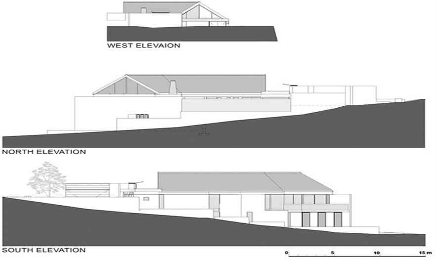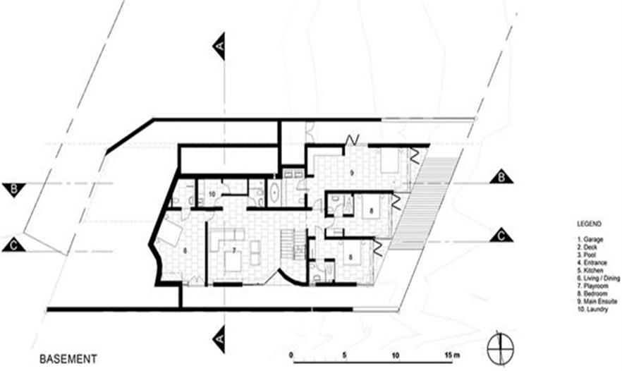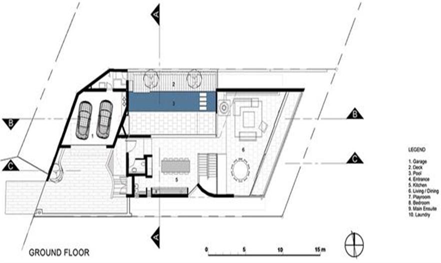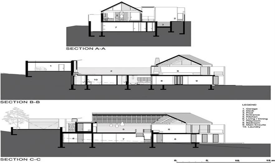 這棟房屋的設(shè)計受到場地三個條件影響,首先是坡度,房屋的車庫以及起居室,開放廚房安放在地面入口層,坡下一層安排臥室,兩層都具有向東觀海的良好視線。然后對待場地盛行的東南風(fēng),設(shè)計師利用滑動玻璃門避開風(fēng)并保證視線通透。最后因為場地位置在南半球,陽光從北向而來,設(shè)計師在北向設(shè)計了帶有泳池的庭院享受陽光。