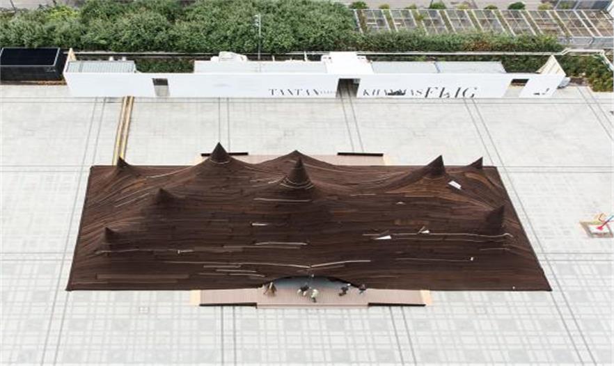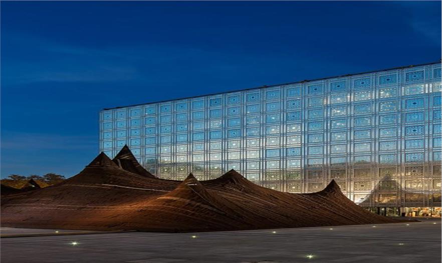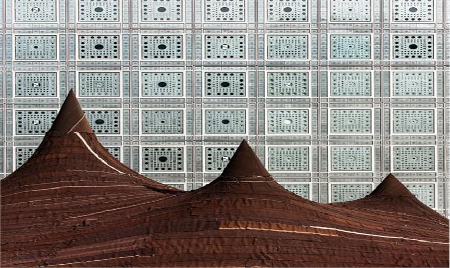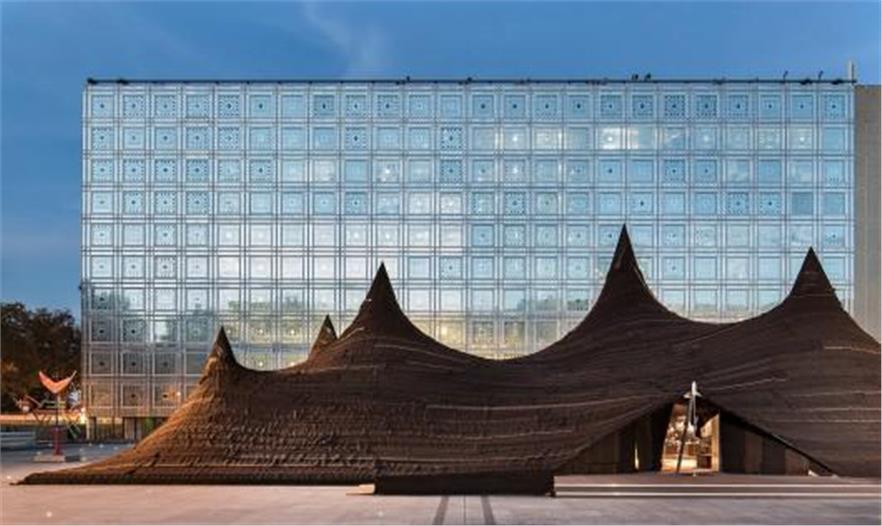 作為當(dāng)代摩洛哥展覽的一部分,近日一個(gè)巨型帳篷出現(xiàn)在讓·努維爾設(shè)計(jì)的巴黎阿拉伯世界研究所外,位于建筑的前方。這個(gè)帳篷的設(shè)計(jì)者是KILO的Tarik Oualalou和Linna Choi,它將當(dāng)代設(shè)計(jì)、技術(shù)創(chuàng)新和傳統(tǒng)的制造方法和諧融合在一起。這座帳篷的材料為超過650平方米的駝絨和山羊毛,由撒哈拉沙漠的女性合作編織而成,它將成為城市地標(biāo)與當(dāng)代摩洛哥展覽的標(biāo)志物。帳篷的剪影映射在建筑上,體現(xiàn)了摩洛哥南部游牧傳統(tǒng)崎嶇的地形維度。