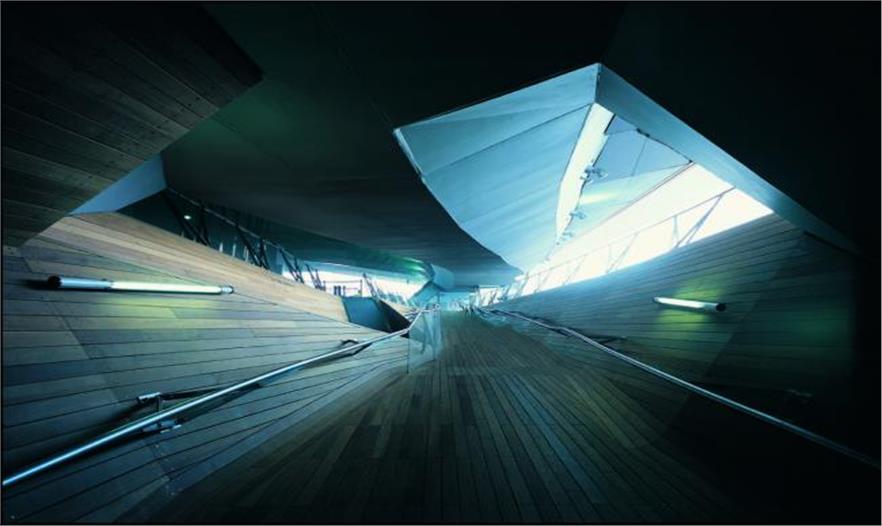 有賴于計算機設計技術的巨大發(fā)展,使得客運中心震撼人心的外觀成為可能。建筑的最初構思基于建筑立面一組微曲表面材料非常復雜組合,形成了一個可航行、可居住的建筑形態(tài)。在瞭望甲板頂上,地板材料如波浪般高低起伏,形成了通道和通向下層廣闊的圍合空間的孔道。這些時而細微時而顯著的高度變化是本項目新奇的建筑語言的精華所在。