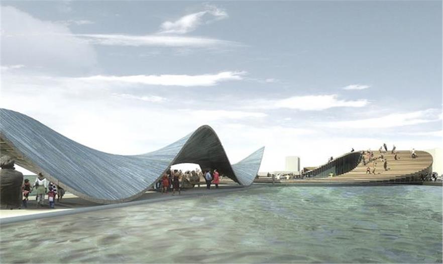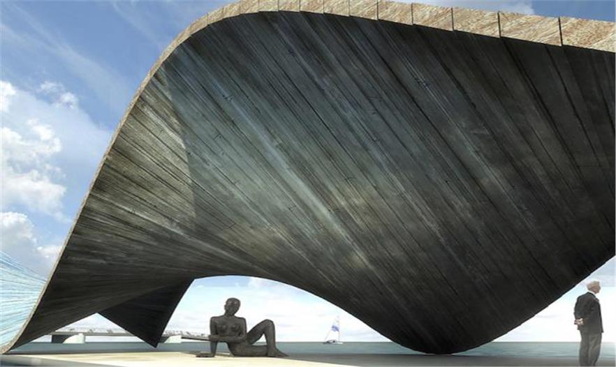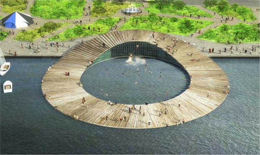從平面上看,建筑以一個簡單的圓環(huán)形式和直線型的平臺嵌入到海洋中,但在垂直空間上,建筑就像是一道濺上海岸的波浪,形成扭曲的形態(tài)感。圓環(huán)形的結(jié)構(gòu)臨案的一邊被抬升起來,形成一面玻璃幕墻,并讓光線透進建筑內(nèi)部。而人們可以在在頂部的屋頂平臺行走,這里不僅提供了一處可欣賞城市景觀的絕佳視野點,同時還可作為下海游泳池的跳水臺。而漂浮的亭臺同樣也很大程度的體現(xiàn)了這種設(shè)計方式,更為波動起伏的的結(jié)構(gòu)為平臺提供了入口,并且引導(dǎo)了向外的開闊視野。