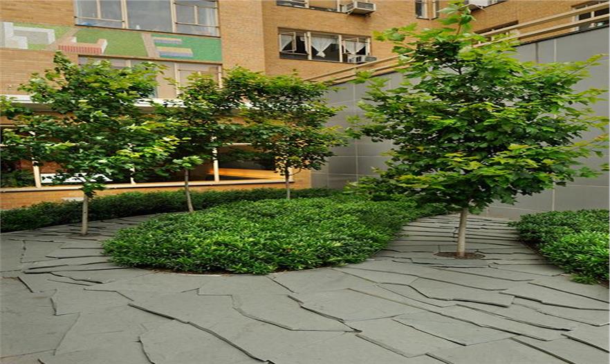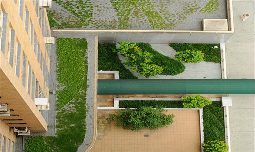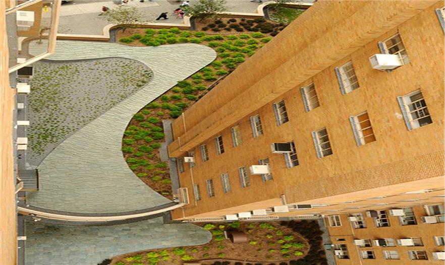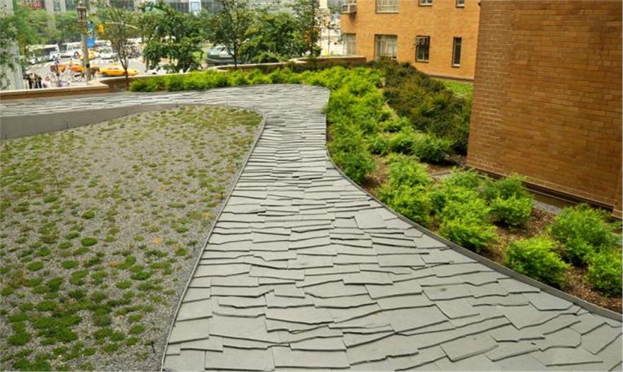 240南中央公園的綠色屋頂和入門庭院把中央花園的特點貫徹到了建筑中,甚至到了屋頂上。起伏帶狀的灌木和景天屬植物沿著板石構成的線相互交叉,就像不同顏色的絲帶一樣,而板石是在公園里模仿露出水面的巖石鋪設的。