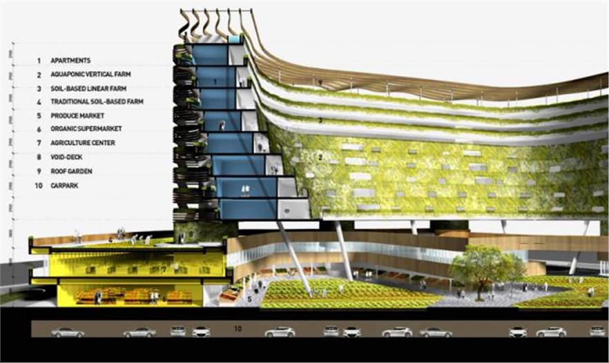 SPARK事務所的指導人史蒂芬•平博理解釋說:“這是我們?yōu)樾录悠略O計的這個概念,但是它有潛力適用于任何一個能夠在建筑外形上和屋頂上生長多葉綠色蔬菜的地方。我們很希望看到這個項目的某些方面能夠在未來實現(xiàn)。這個概念是個可實現(xiàn)的方案,能解決世界上許多發(fā)展的城市面臨的一些問題。”