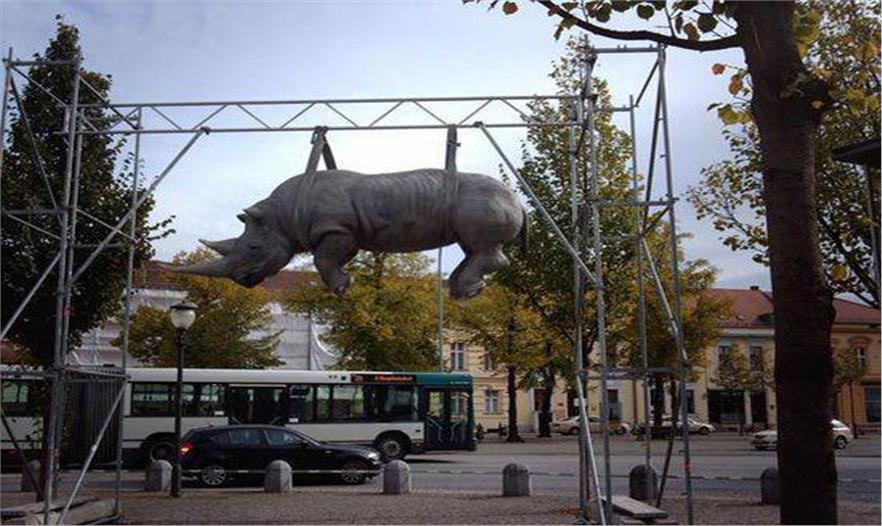 在德國波茨坦,無數(shù)美景和新奇事物等待你去發(fā)現(xiàn)。而其中,路易斯廣場上的一座雕塑一定會令你停下匆匆腳步,駐足欣賞。它是一只非常奇特怪異的被吊起來的犀牛。關(guān)于這座雕塑,人們所知道的并不多。不過有一點可以肯定,它是由意大利的藝術(shù)家Stefano Bombardieri創(chuàng)作的。而且,這只犀牛的重量十分驚人。