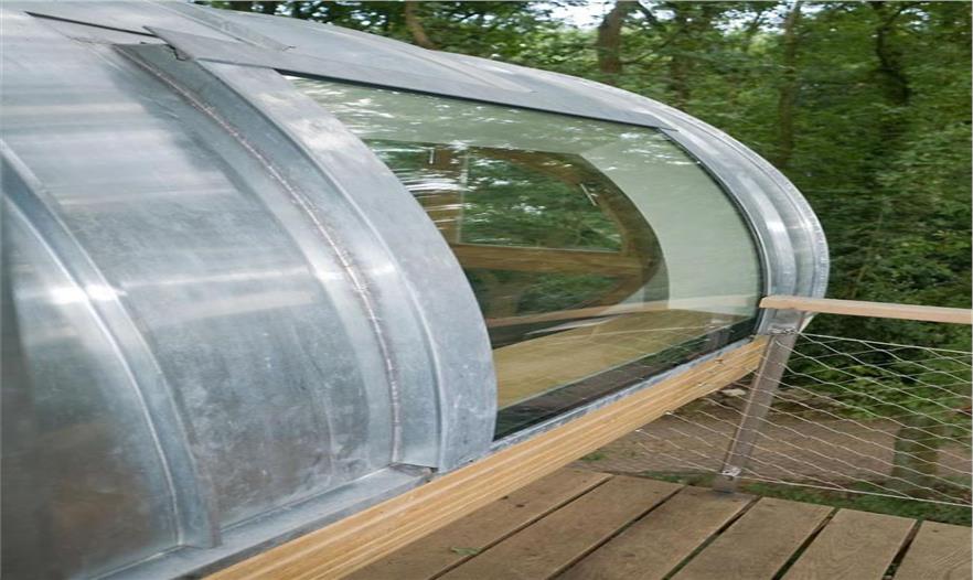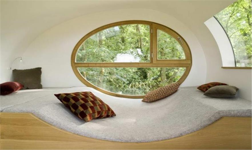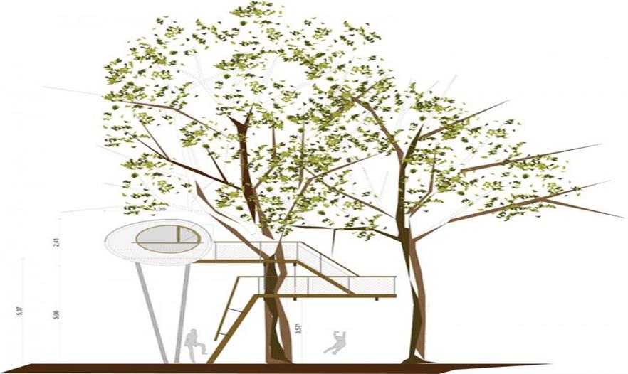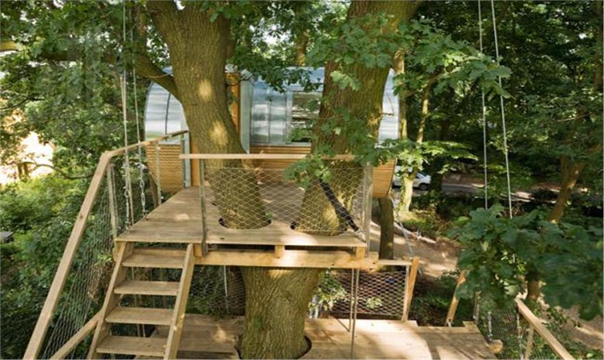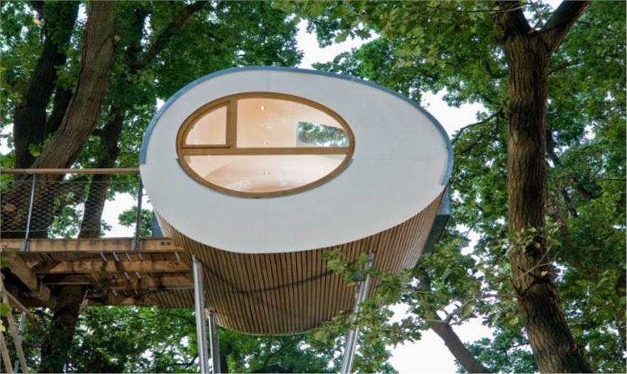 為了在德國北部樹木繁茂區(qū)為家庭建造一個舒適的避世空間,Baumraum在兩個橡樹之間建造了樹屋djuren。這個結(jié)構(gòu)是雞蛋狀的結(jié)構(gòu),并通過橢圓形的窗戶和白色光滑的表面加強(qiáng)了這一特色。內(nèi)部空間有睡覺的長凳,上面鋪有灰色的絨毛氈,為森林環(huán)境創(chuàng)造出更多的景點(diǎn)。人們通過兩個船梯到達(dá)樹屋,但這兩個船梯被離地平面3.8米高度上一個較低的平臺分離開。第二個甲板位于空中5.6米的高度上,包含進(jìn)入到這個高架樹屋的入口。這個小屋的垂直重量由四個傾斜的鐵架承受,同時通過與樹木的連接得到了穩(wěn)固。這兩棵橡樹也承受著兩個平臺的重量,由大量的纜繩和紡織條固定。對比雞蛋狀小屋白色的兩端,小屋底部和平臺都是木頭制成的,而屋頂是由薄鋅板覆蓋?;⌒蔚拇皯羟度氲叫∥萸懊鎴A形的結(jié)構(gòu)中,可以觀賞到戶外的景色。
