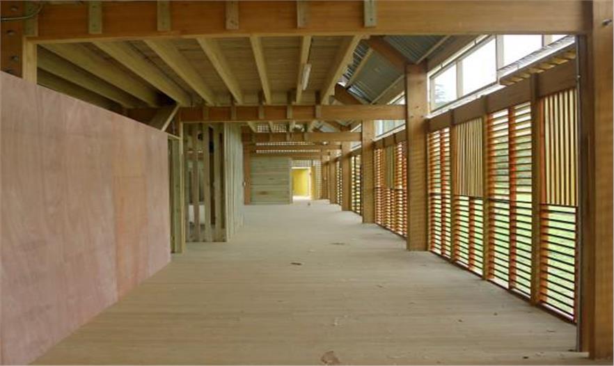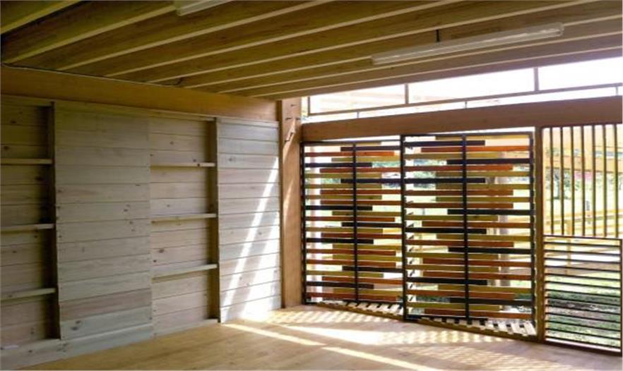 旅館項(xiàng)目包含在470平方米的規(guī)模中,沿著縱軸線建造在大型的線性結(jié)構(gòu)中。第一層包括行政區(qū)、多功能房間、用餐區(qū)、廚房、衛(wèi)生間、電腦室、圖書室和倉庫。建筑前面部分是兩層的高度,形成一個(gè)“夾層樓”,作為臨時(shí)遮蔽區(qū)。