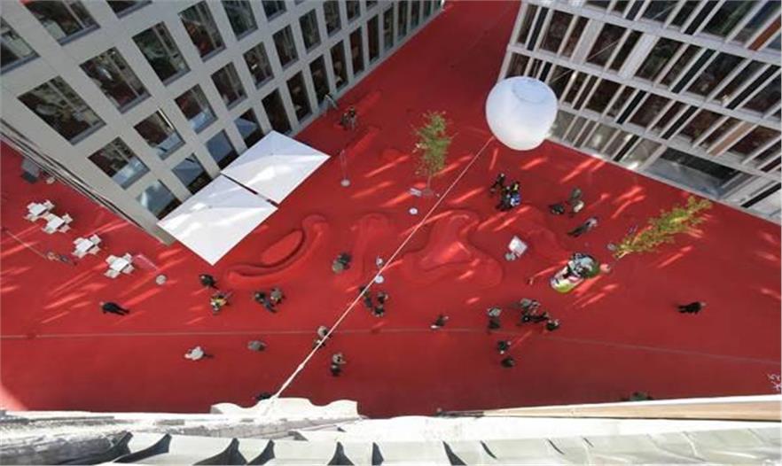 圣加侖州Bleicheli Quarter的City Lounge是一項(xiàng)創(chuàng)新項(xiàng)目,是城市設(shè)計(jì)與藝術(shù)的結(jié)合。這個開放空間被藝術(shù)家Pipilotti Rist和建筑師Carlos Martínez 重新設(shè)計(jì),戶外空間是紅色地面涂料,由橡膠顆粒制成的。所有的城市設(shè)計(jì)元素在紅色地表下都黯然了,建造出一個獨(dú)特的公共空間——城市中心的紅色景觀。