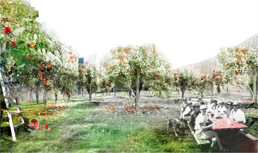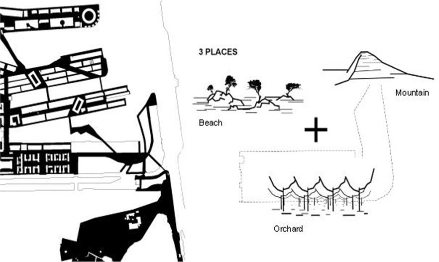 阿姆斯特丹東部海港區(qū)是充滿特色的一個(gè)地區(qū),有許多高質(zhì)量的公共空間。Cruquius半島是該城市發(fā)展的最后一個(gè)區(qū)域。這個(gè)區(qū)域現(xiàn)在是單功能、擴(kuò)散性的區(qū)域,Cruquius大道是唯一的一個(gè)公共空間,所以可以建造一定數(shù)量的公共空間。這是我們提議在半島上建造三個(gè)特色公共空間—果園、海灘和山的原因。