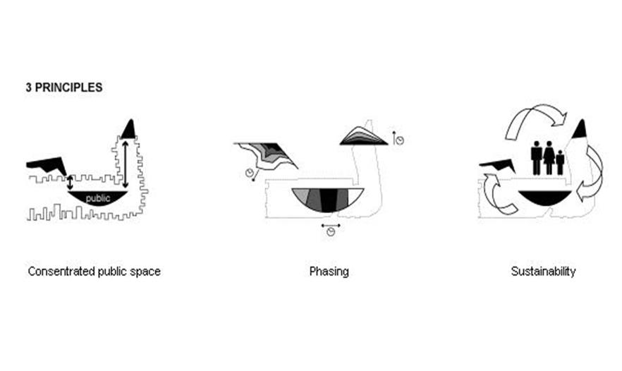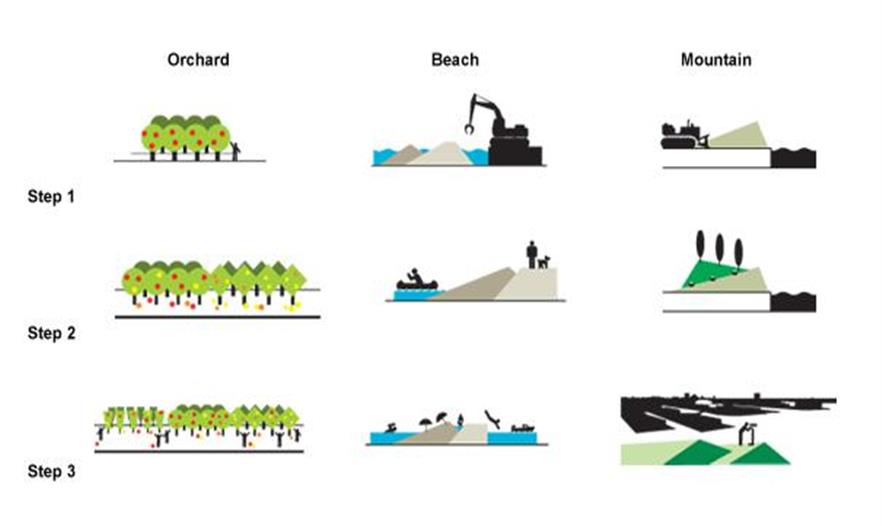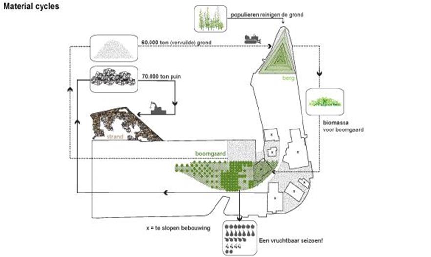 果園是Cruquius區(qū)中央的公共空間。它會(huì)隨著時(shí)間變大,擴(kuò)充果樹(shù)的種類。海灘是一個(gè)漂浮空間的定位點(diǎn),是東部海港區(qū)和Flevopark之間的一個(gè)新自行車通道的墊腳石。這個(gè)海灘是由Cruquius上被摧毀的建筑的碎片構(gòu)成的。山位于半島的遠(yuǎn)端,從建筑區(qū)域阻截被污染的土壤。區(qū)域發(fā)展的越多,山越大。最后它會(huì)為阿姆斯特丹呈現(xiàn)出壯觀的景點(diǎn)。