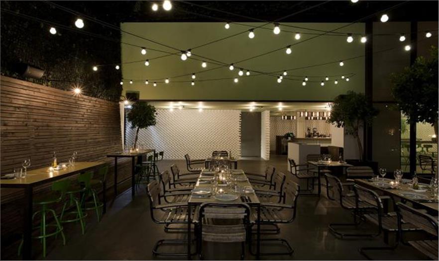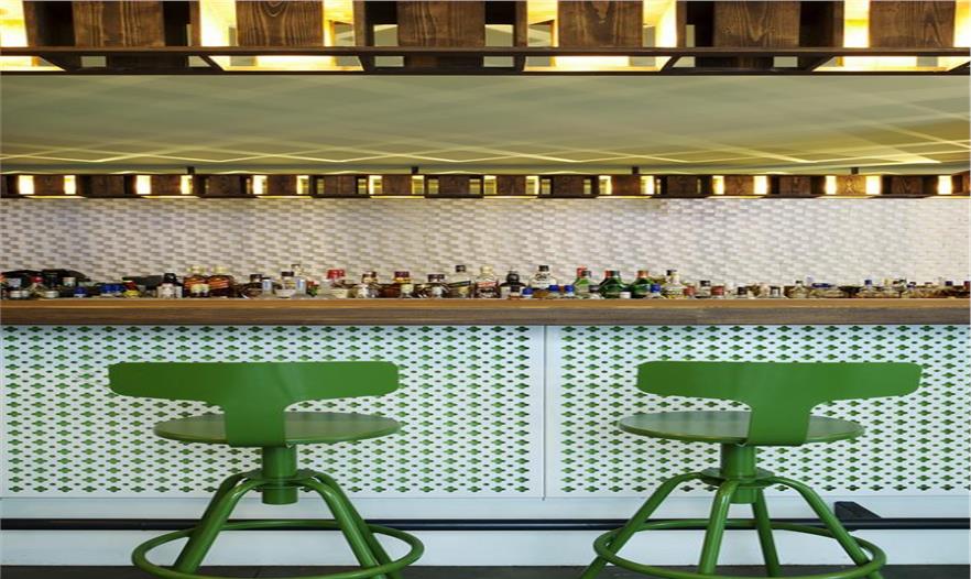 室內(nèi)表層的人工常春藤和超大的木制長凳營造出了一個(gè)超現(xiàn)實(shí)空間,通過使用一系列燈、舒適的木椅、綠色高腳凳和黃色的桌面,讓空間多出幾分暖色。