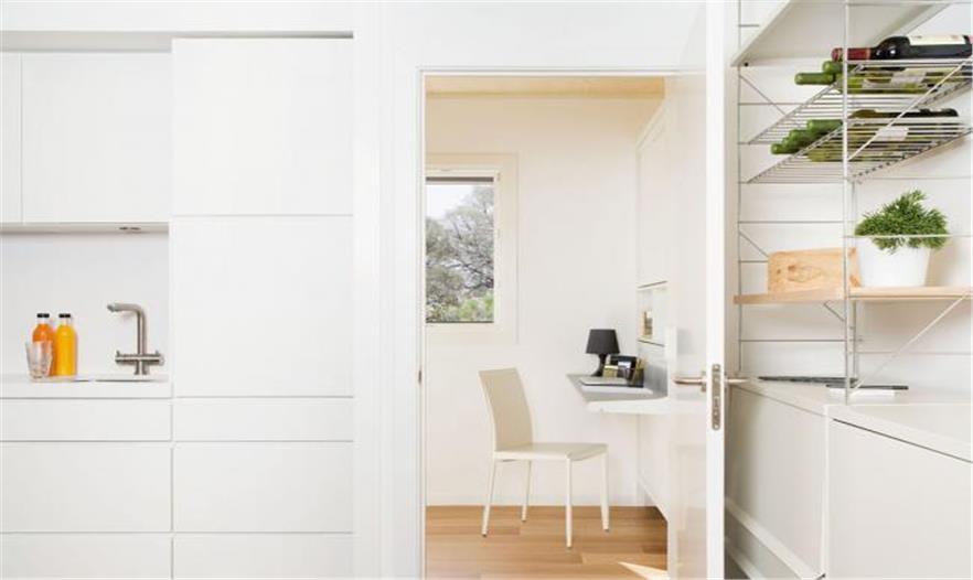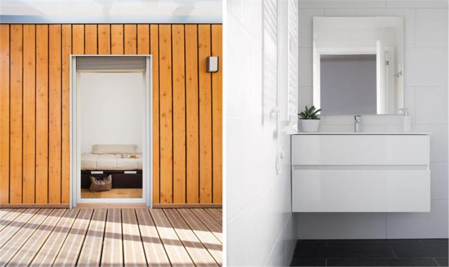 9 × 4.5 m附帶照明設(shè)備的大木屋內(nèi)起居設(shè)備一應(yīng)俱全,通過一面3m長的大型伸縮窗與主廳相連,合二為一。另外一個9 x 3 m的木屋有兩個房間,一個是客房一個是可供起居的書房。