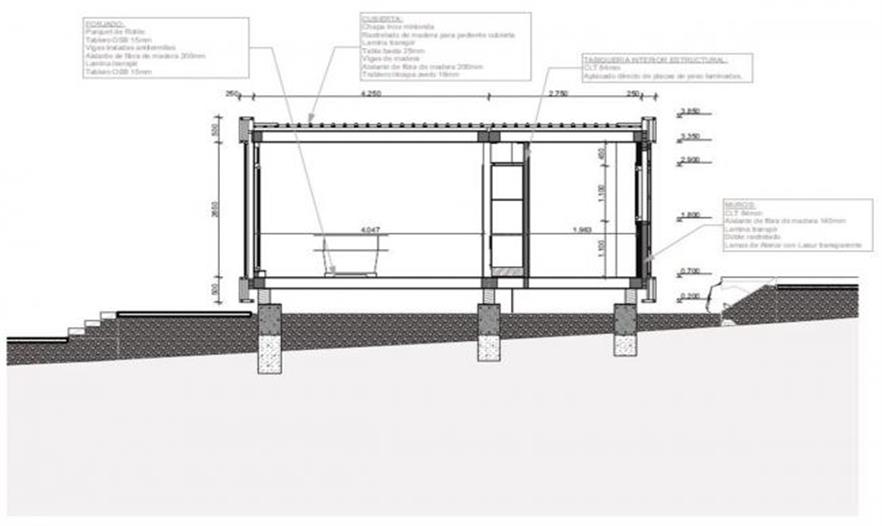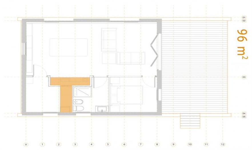 木屋由水泥板和81 mm厚的木材板組裝成。16cm厚的木質(zhì)纖維板對房屋內(nèi)部起良好隔熱作用。屋子的墻體其實是用松木裝在豎立的通風柜上。于是玻璃窗實用性非常強。室內(nèi)的木條板、木質(zhì)地板和白色墻體整體很協(xié)調(diào)。
