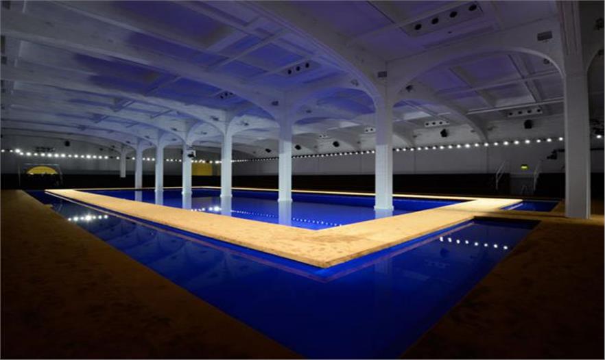 當(dāng)代建筑師對(duì)水的喜愛在米蘭6月舉辦的Prada2015春夏男裝T臺(tái)秀也是顯而易見。例如,建筑師Rem Koolhaas的工作室OMA經(jīng)常和Prada公司合作,它創(chuàng)造了可移植展館來展現(xiàn)意大利品牌的文化項(xiàng)目 – 利用地下廠房空間,魔法般變出寶石藍(lán)色水池和像是懸在水上的長(zhǎng)方形T臺(tái)。OMA把這個(gè)超現(xiàn)實(shí)環(huán)境描述成“處于洞穴、游輪和室內(nèi)泳池之間”。當(dāng)大多數(shù)建筑師因?yàn)樗淖匀粚傩远廊徊捎脮r(shí),相反,OMA把水排布成過度人工化的冷冷的靜態(tài)表面。
