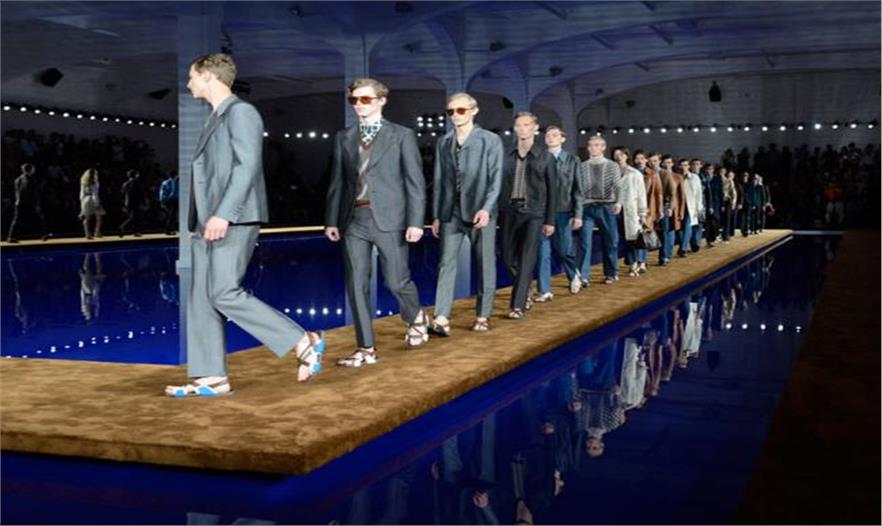 OMA公司去年6月為Prada2015年米蘭春夏男裝系列設(shè)計(jì)的超現(xiàn)實(shí)T臺(tái),搭配了別具風(fēng)格的寶石藍(lán)色水池,在地下廠房空間打造了地毯時(shí)裝表演。