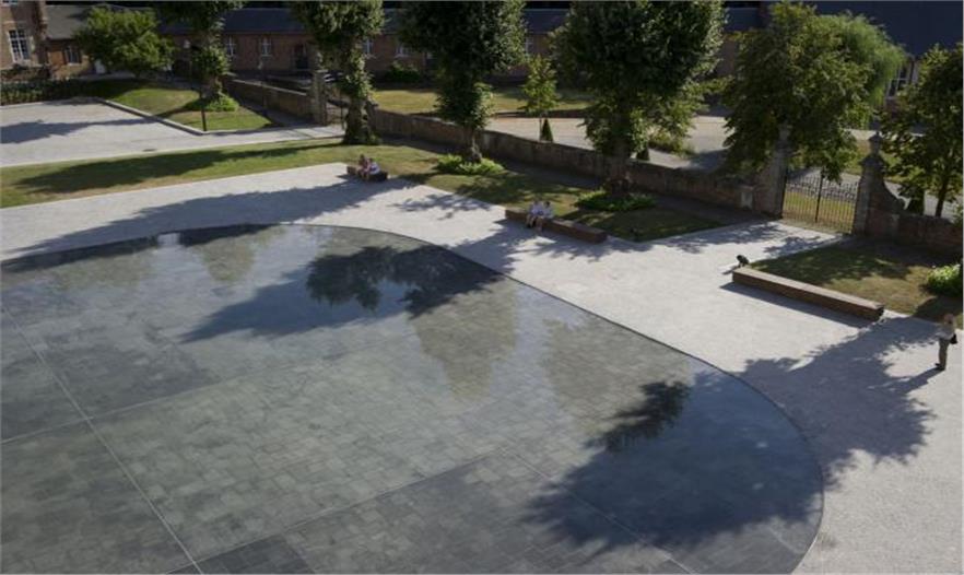 比利時(shí)建筑師OMGEVING設(shè)計(jì)的淺水池在建于17世紀(jì)的迪斯特修道院廣場(chǎng)院子里,盡管這里水是主要的焦點(diǎn),它也同樣受到場(chǎng)地的局限。平靜清澈的水用圓角和不明顯的邊界形成了簡(jiǎn)單的有機(jī)形狀,像無色箔片映射出教堂的巴洛克式建筑。就象TVK工作室設(shè)計(jì)的水池,這里的水淺到能讓人涉足其中。