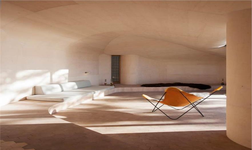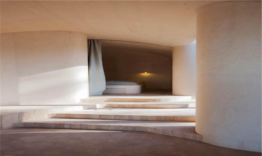 室內(nèi)是個連續(xù)的空間?;⌒蔚膲Ρ诤臀蓓敇?gòu)成了一個連續(xù)的表面,并覆蓋著4毫米的樺木膠合板。根據(jù)地形設(shè)計的地板把這個方案分成了幾個層次空間,并有不同的功能。這些層次空間要有階梯來進(jìn)行過渡,這樣就有各種空間可以坐下和躺下休息。