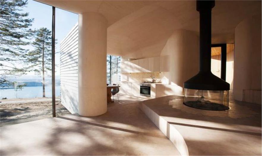 壁爐位于小屋的中心,設(shè)在主要活動區(qū)域的地面上,并有篝火的感覺。從小屋不同的層次空間上來看,你可以遠(yuǎn)離壁爐或是在它旁邊躺下休息。