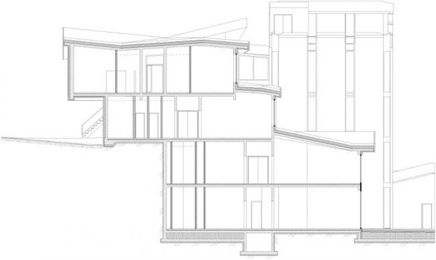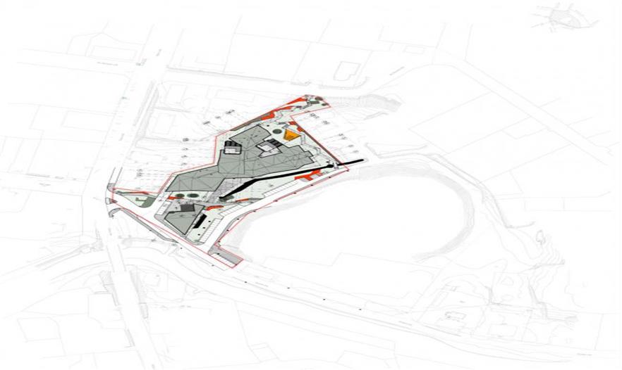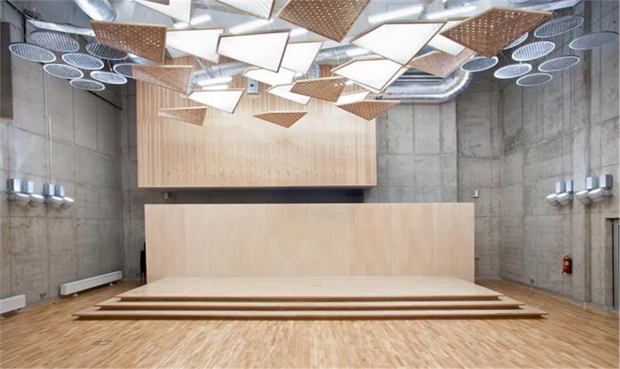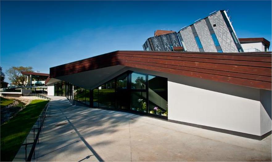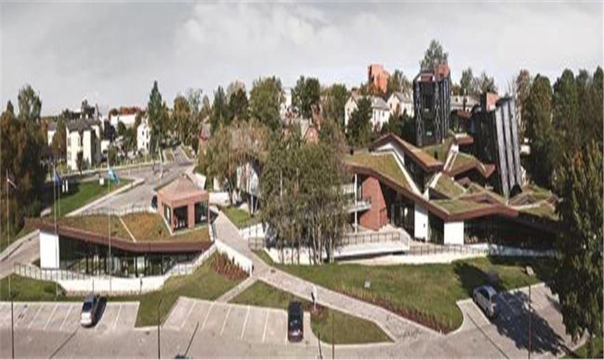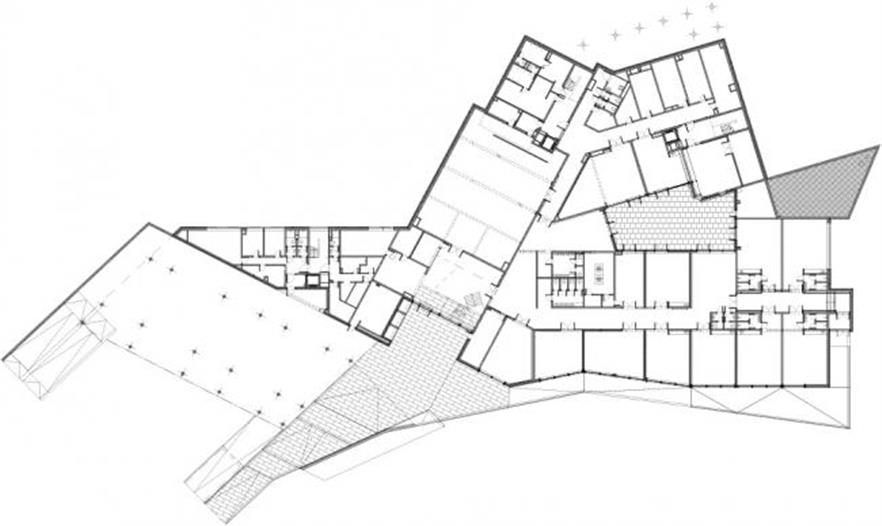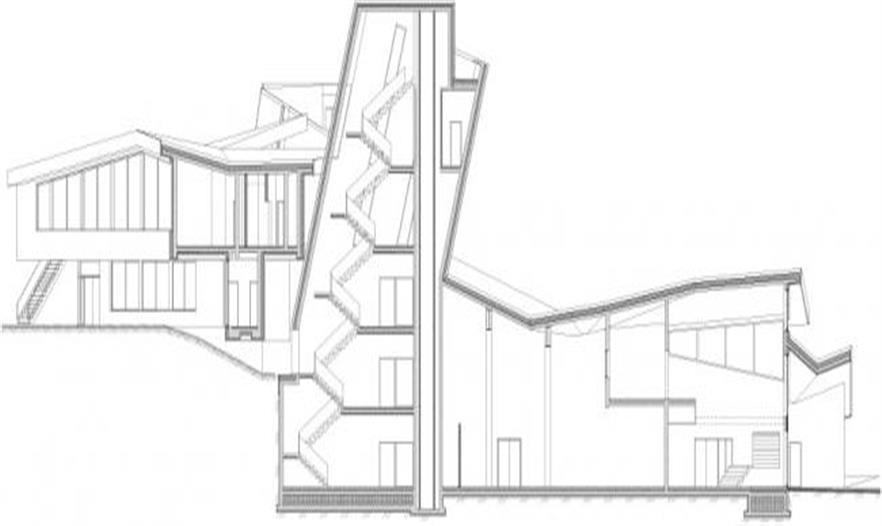 “……在城市中心的邊緣地帶,一個(gè)戲劇性的景觀面對(duì)著城市主要的游客目的地——古老的城堡土丘和政府保留下來的中世紀(jì)廢墟。 讓建筑深植于土地,而且讓第五立面——幾何三角分割的綠色屋頂——成為建筑主要特色的正是基地本身。建筑是一個(gè)整體的混凝土結(jié)構(gòu),直接暴露在外部。大部分的房間在平面上仍然是矩形的——外露混凝土的戲劇性天花板和變化的窗形創(chuàng)造出驚人的多樣性和空間的獨(dú)特性。屋頂?shù)脑煨筒坏珵楹⒆觽儙砹吮Wo(hù)和安全感,而且讓豐富多樣的自然光束通過不同的開口照射進(jìn)大堂,走廊以及所有的房間,而在夜晚從外部看起來建筑像是神秘地閃耀著。首層一個(gè)溫馨的內(nèi)部庭院把光線帶到一些離表面較遠(yuǎn)的房間。建筑周圍的景觀,包括混凝土和綠色表面,都延續(xù)著在屋頂使用的幾何圖形要素,有一種讓人驚奇的雕塑感,并且每個(gè)細(xì)節(jié)都帶有藝術(shù)感。新建筑成為了現(xiàn)有夸張?jiān)煨途坝^不可分割的一部分,甚至成為了當(dāng)?shù)赝捄蛡髡f的一部分,進(jìn)一步拓展人們的想象。這是一個(gè)當(dāng)代設(shè)計(jì)的范例,建筑從周邊實(shí)質(zhì)和情緒,從本地精神和傳統(tǒng)原型環(huán)境出發(fā),為孩子們提供了一個(gè)溫暖而友好的新環(huán)境。盡管面積多達(dá)六千平方米,建筑還能讓人感到人性化和賓至如歸,與城鎮(zhèn)中心的小規(guī)模歷史建筑相得益彰。”