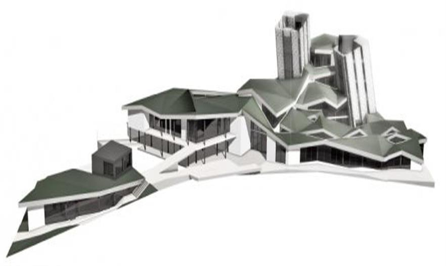 插在綠色空間體量中的“鉛筆”是現(xiàn)存蘇聯(lián)時(shí)期建筑的前景。