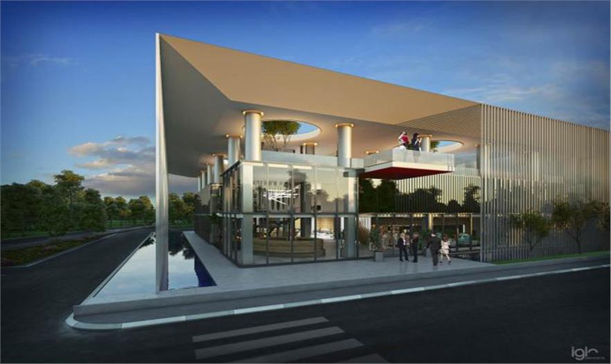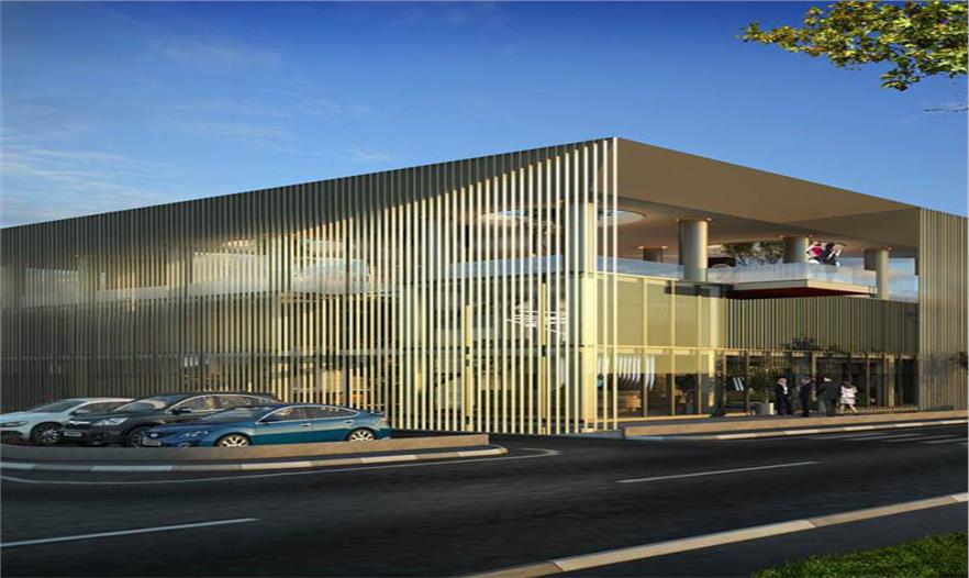 垂直的遮陽(yáng)板起到了瀑布的視覺(jué)效果,從屋頂上滑落到環(huán)繞建筑的水中,緩和大量建筑群的景觀效果。