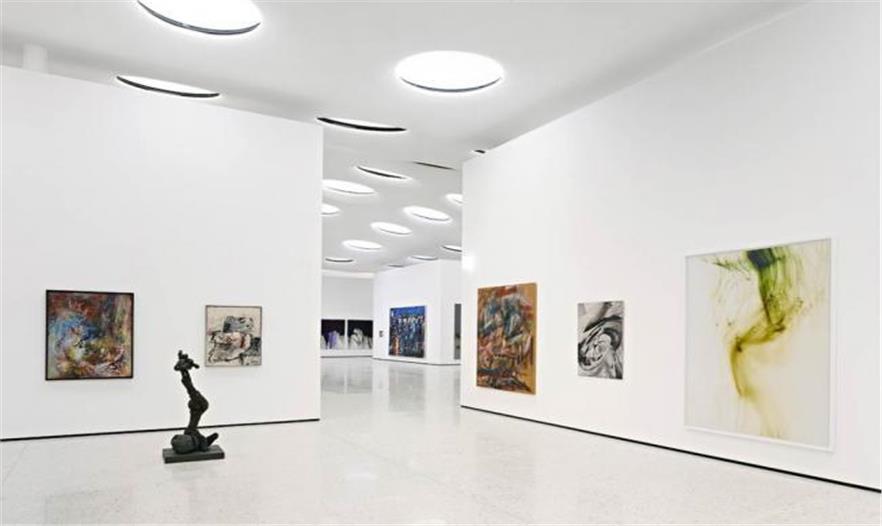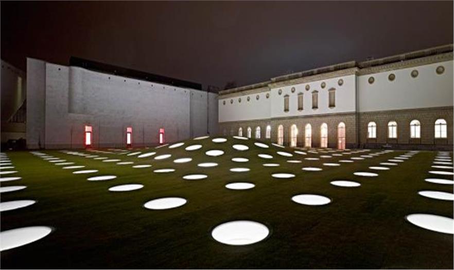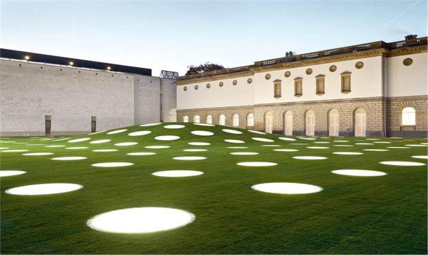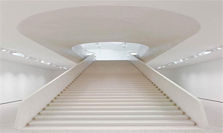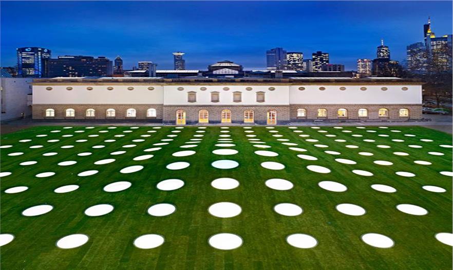 新的展覽空間是圓蓋屋頂,由12根纖細(xì)的鋼筋混凝土柱支撐,位于博物館庭院的小山丘下面。混凝土石塊上鑲嵌有195個(gè)圓形天窗(從外緣1.5米直徑到中心最高點(diǎn)的2.5米不等)。這些“藝術(shù)之眼”突出強(qiáng)調(diào)了這個(gè)擴(kuò)展項(xiàng)目的多學(xué)科性特征——這些孔徑可能會被看作一個(gè)綜合藝術(shù)作品,同時(shí)闡明這個(gè)地下空間充足的日光其實(shí)是由綜合性的LED燈和內(nèi)置的陰影元素控制的。