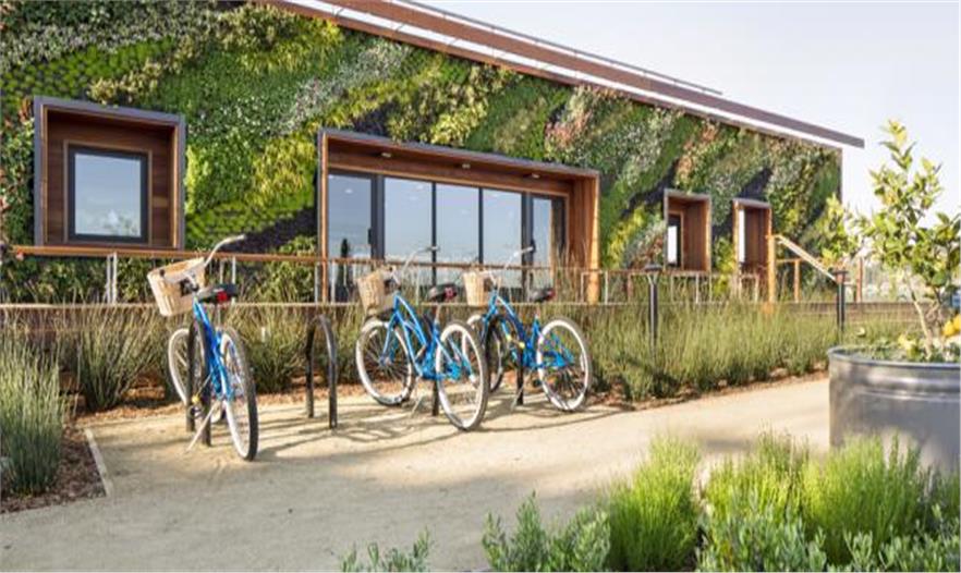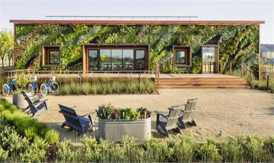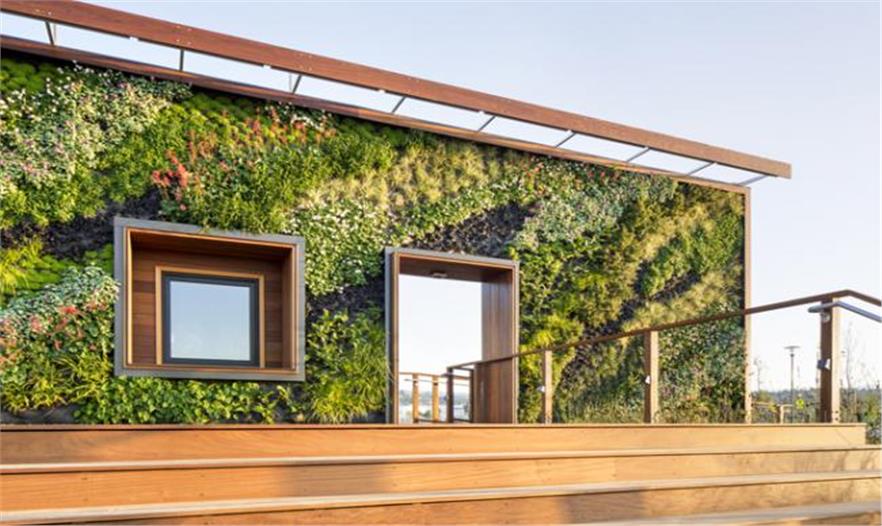在CMG事務所的幫助下,Habitat Horticulture的大衛(wèi)•布倫納設計和建造了Bay Meadows Welcome Center的這個綠墻。這個86英尺長的墻面上有能吸引蝴蝶和傳粉動物的植被,包括可食用的薰衣草、珊瑚貝、野草莓和芳香植物。該中心是由BCV Architects事務所建造的。