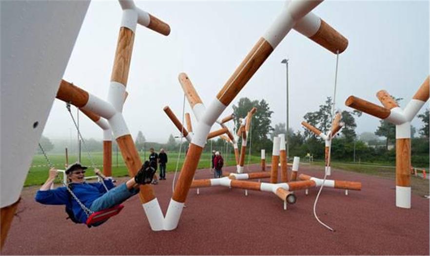 游玩區(qū)域Play Zone適用于各個(gè)年齡段的人們游玩和鍛煉。它的中心元素——由圓木建造的大量的幾何“樹”——是用于攀爬、重量訓(xùn)練或蕩秋千的好地方。這個(gè)區(qū)域是孩子和大人的游樂場(chǎng)。