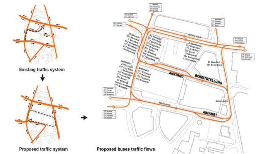 在漢堡的邊緣區(qū)有該城市第2大的公共交通樞紐——Barmbek。由于幾年以來它被忽視和不受控的情況,導(dǎo)致了現(xiàn)在的混亂情景。事務(wù)所提議不要只清理這個(gè)公共空間,要對(duì)Bahnhof的空間組織進(jìn)行一個(gè)全面的再思考過程,并調(diào)整交通流來促進(jìn)這個(gè)項(xiàng)目的展開。事務(wù)所提議一個(gè)簡單的交通規(guī)劃、一個(gè)明確的層次結(jié)構(gòu)、較少但更好的公共空間。