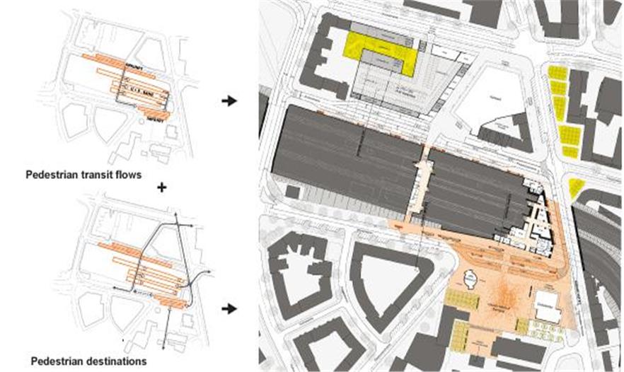 事務(wù)所提議在地鐵站的北邊建造一個(gè)功能區(qū),是所有汽車到達(dá)、乘客能立刻進(jìn)入地鐵、或是行人走路回家的地方。在這里我們會(huì)建造一個(gè)新的街坊式建筑,把房屋和商業(yè)規(guī)劃加入到人行通道上。