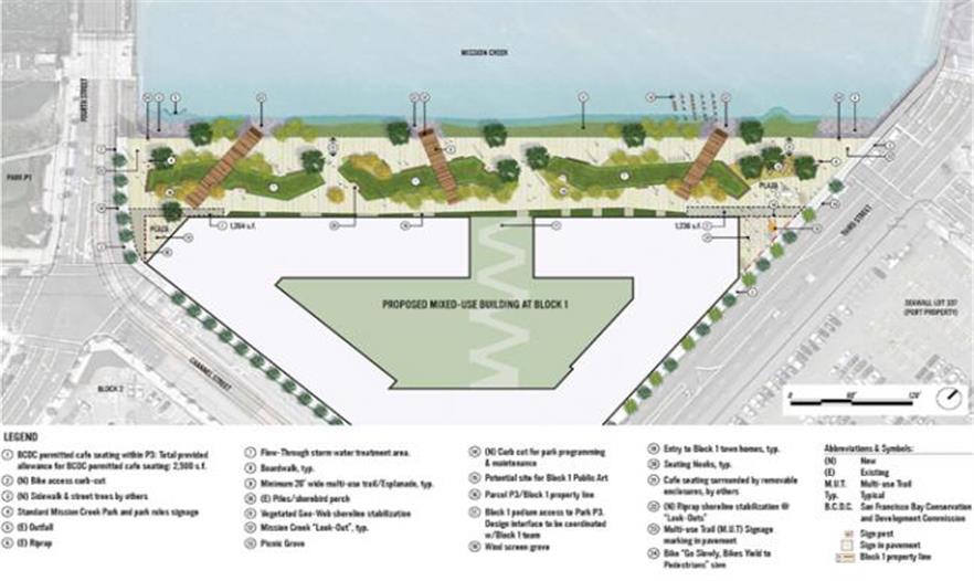 P3公園是進入米遜灣南部街區(qū)的入口,是米遜溪公園P1和中國盆地花園的連接點,是未來功能混合發(fā)展的補充項目,以及水上的一個絕佳區(qū)域,能觀賞到舊金山灣、美國電話電報球場以及雙子峰的景色。P3公園的主要身份是一個充滿生氣的城市廣場和濱水大道。公園設計的主要動力是該區(qū)域雨水整治的需求。設計目的是確保這些整治區(qū)域不僅具有功能性還漂亮;它們的幾何形狀建造出聚集空間,還要從米遜溪沿線更多的開放和公共空間中緩存出Block 1地塊沿線更多的私密空間。