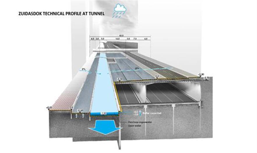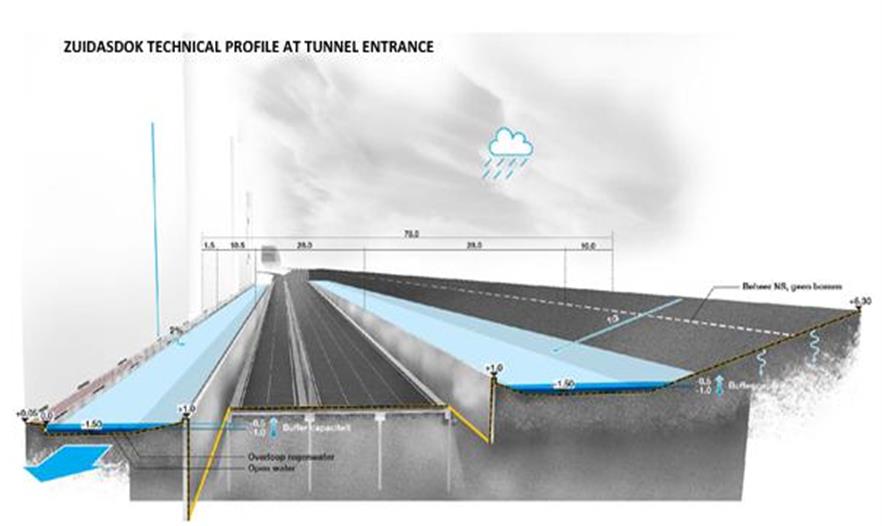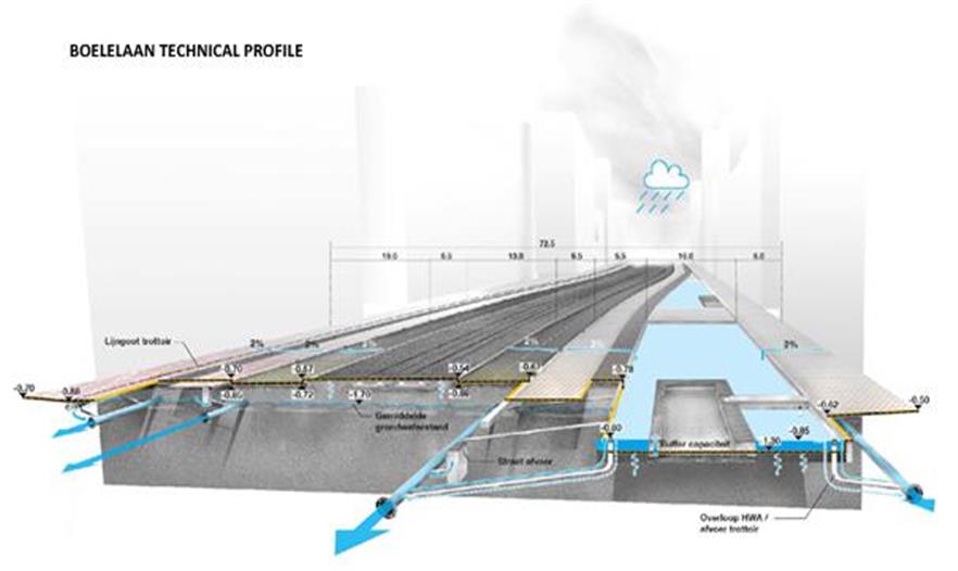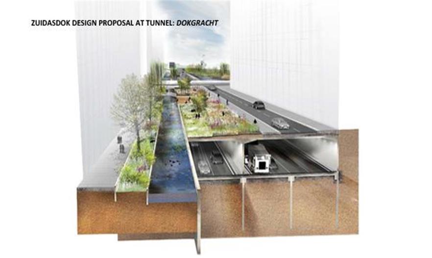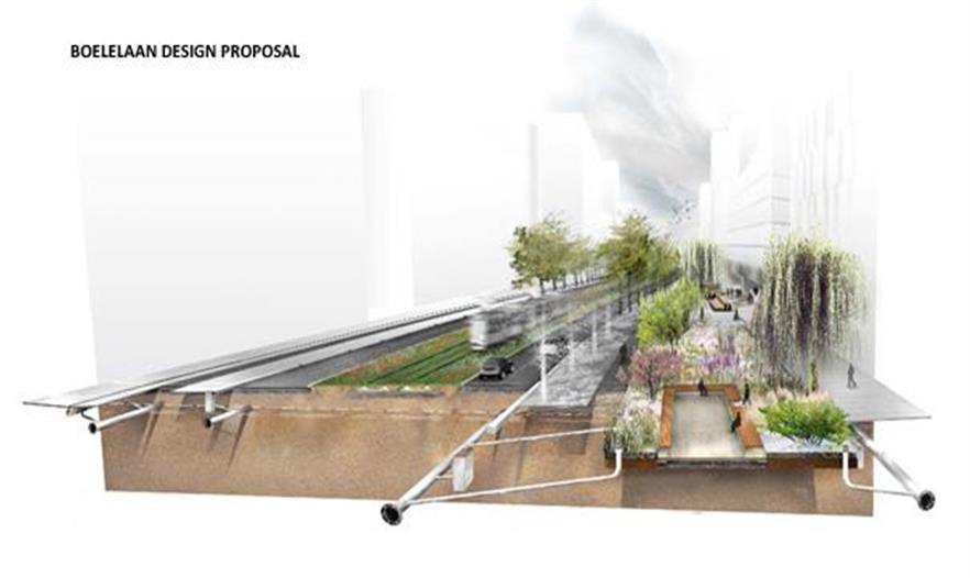 設(shè)計方案包括3個防水的基礎(chǔ)設(shè)施長線和2個特殊的空間。對于這5個介入空間,事務(wù)所把對公共區(qū)域質(zhì)量的改善和雨水緩沖容量增加的工作結(jié)合了起來。尤其在3條長線里,事務(wù)所把它們與公共空間的大量綠化和軟化結(jié)合了起來:Boelelaan、Mahlerlaan、Zuidasdok。最后一個是很具有策略性的:它把鹿特丹南部環(huán)形通道A10的隧道與整個南軸線的水系統(tǒng)的結(jié)構(gòu)改善工作結(jié)合起來設(shè)計。