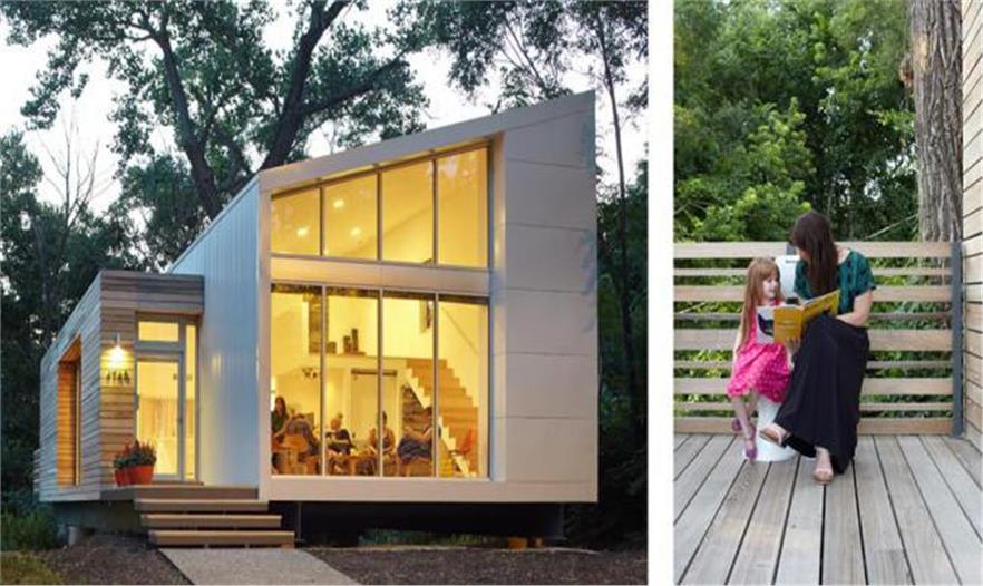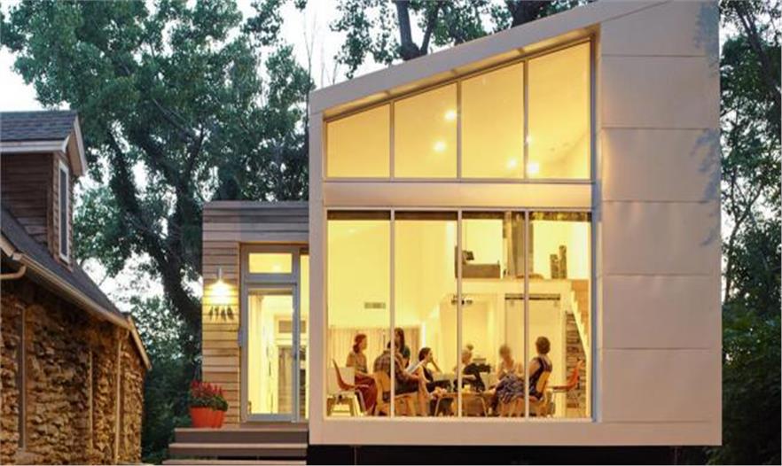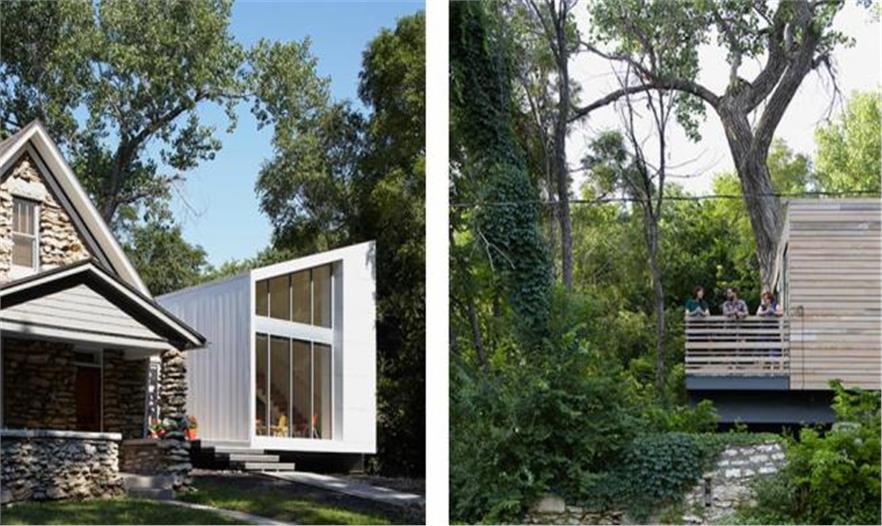 這座房屋建在堪薩斯城一個(gè)狹窄的空地上,在入口處有個(gè)鋼結(jié)構(gòu)的立面,外層由回收的柏樹包裹。整個(gè)結(jié)構(gòu)位于混凝土墩的鋼鐵基座上。