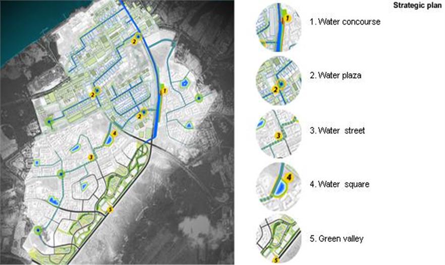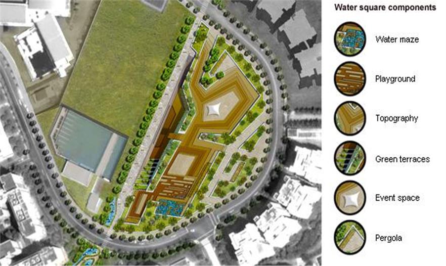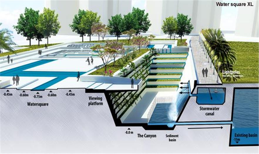 該事務所提議的策略要遵循3個原則:讓人們更接近于水;讓水更接近于人們;采用綠植凈化水源。所以設計師把現(xiàn)有的混凝土系統(tǒng)轉變成柔軟的、綠色的和藍色的公共空間,如走廊、公園和廣場等。設計師也讓雨水在區(qū)域上保留的時間長一點,供人們體驗和游玩。所以設計師在選擇好的地點上引入了建造水廣場的理念。設計師會對水廣場進行精心地設計,并設置瀑布作為顯著的特色。
