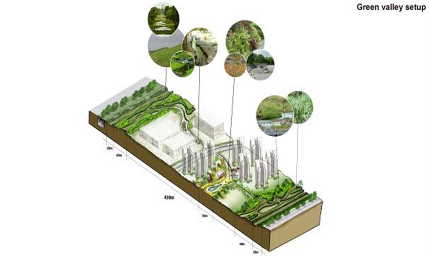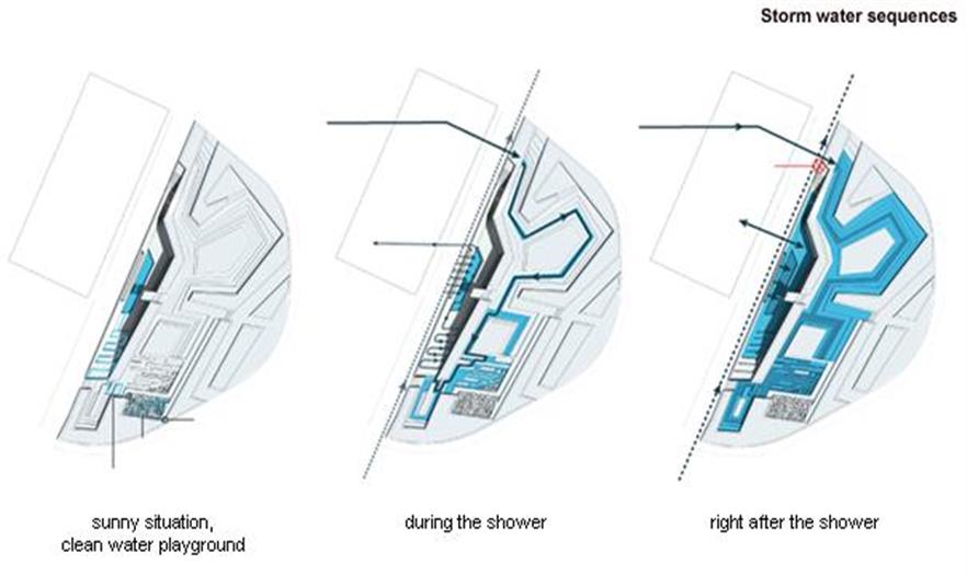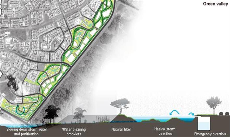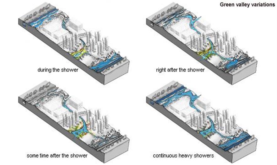 對于一個新的發(fā)展區(qū)域,設計師把水收集融合到了這個城市規(guī)劃當中。通過這樣做,設計師把價值增加到未來的房地產(chǎn)行業(yè)上。在這個“綠谷”里,水的徑流被控制在后來的幾個階段里。在“綠谷”的中心,水最后被用來灌溉植被,為社區(qū)建造一個繁茂的公共空間。在所有的方案當中,天氣條件的變化與一個動態(tài)的空間體驗緊密相連。