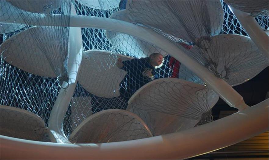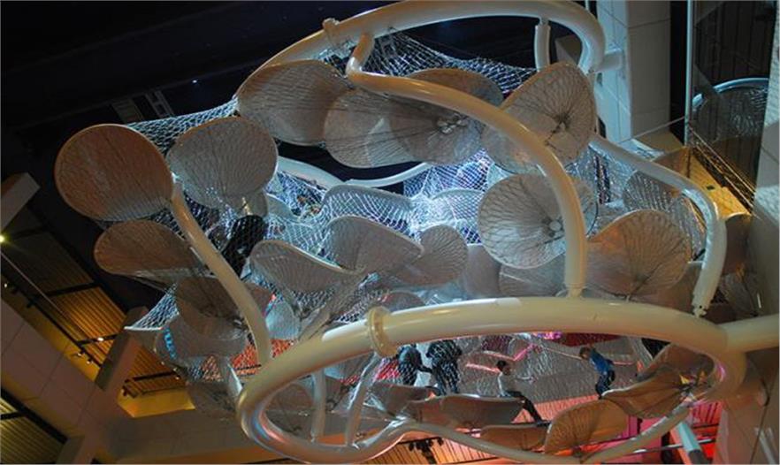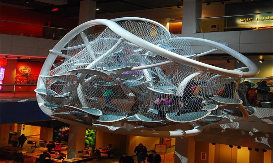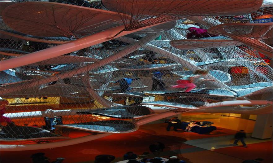 這個管道形式多樣,在空中散布有平臺;這個游樂設(shè)施離地面大約有35英尺,是這個裝置的一個特色。游客進行升降活動,手腳并用,穿梭在一個球形的曲道中,顯示出了這個建筑結(jié)構(gòu)的原始想法。