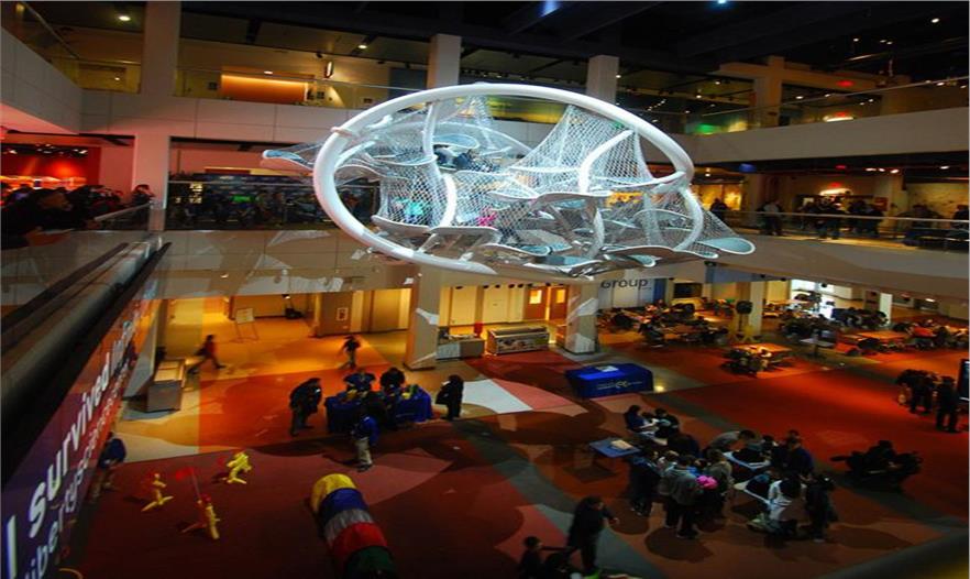 這個游樂設(shè)施位于澤西城自由科學(xué)中心的中心位置,自由女神像的對面。設(shè)計師用精巧的支架把這個游樂設(shè)施懸掛在大廳上面,與現(xiàn)有的混凝土結(jié)構(gòu)結(jié)合在一起,設(shè)計形式大膽、新穎。