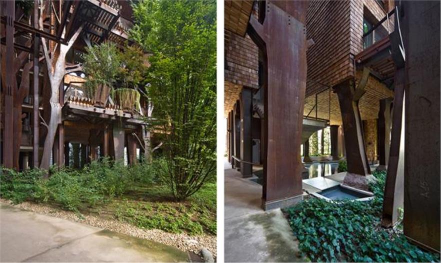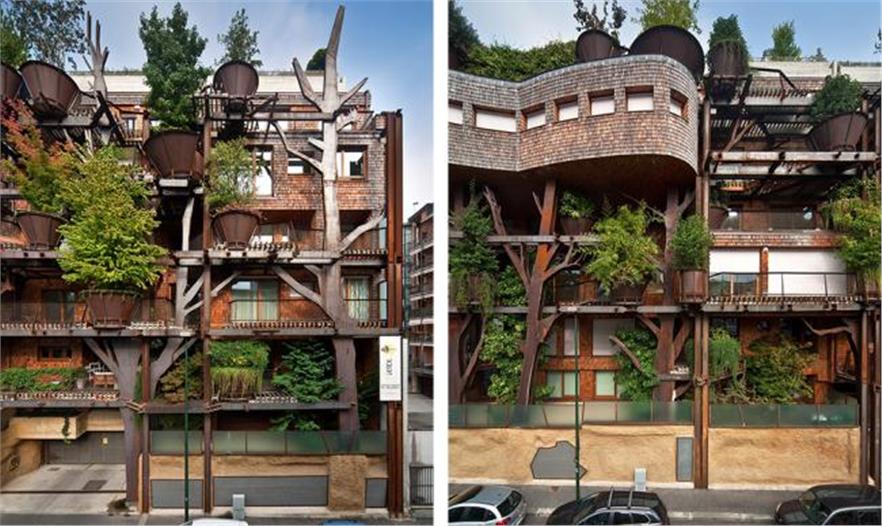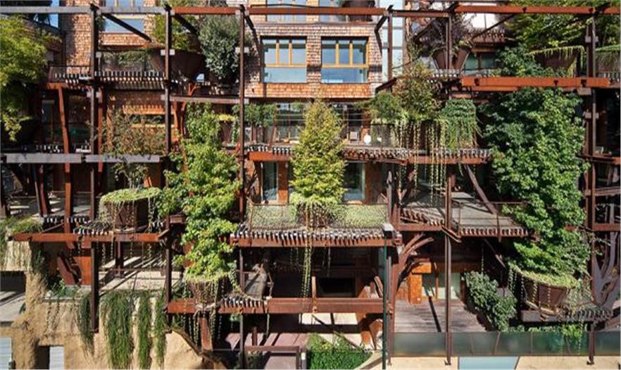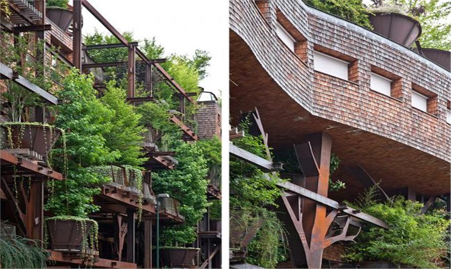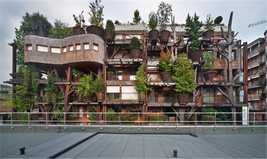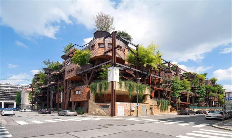 一座新的住宅在都靈建成。其為鋼架結(jié)構(gòu),樹(shù)木扎根在不規(guī)則形狀的陽(yáng)臺(tái)上,池塘與房屋基腳相交,蔥郁的花園覆蓋了屋頂,看起來(lái)就像一片森林。而人們也是這般感受,建筑就像是兒時(shí)夢(mèng)想中時(shí)常會(huì)搭建的樹(shù)屋。一座活森林建筑。