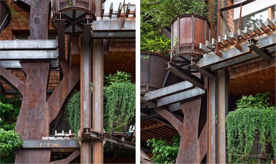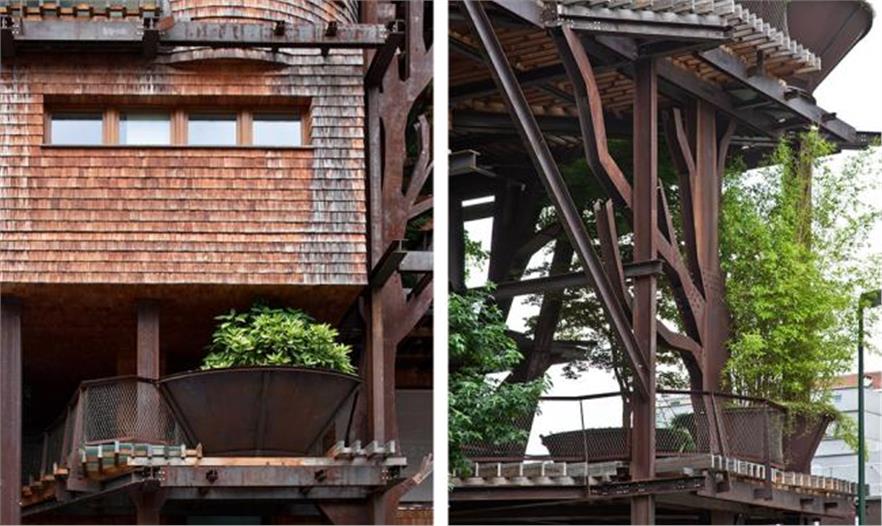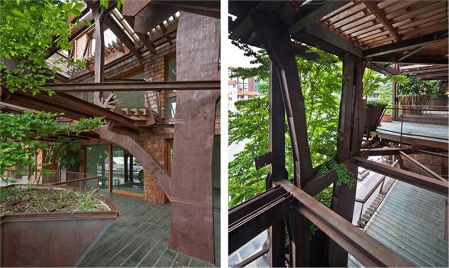 實(shí)木條板鋪滿陽(yáng)臺(tái),夏天過(guò)濾陽(yáng)光,冬天又能讓光線穿進(jìn)房間。落葉松材質(zhì)的木瓦板做成的護(hù)壁板形成柔軟又充滿生機(jī)的表面。金屬結(jié)構(gòu)看起來(lái)像樹(shù)木,它們從底樓“生長(zhǎng)”到頂樓,支撐著陽(yáng)臺(tái)的木板:這些結(jié)構(gòu)與植被纏繞,形成一個(gè)獨(dú)特的外觀。