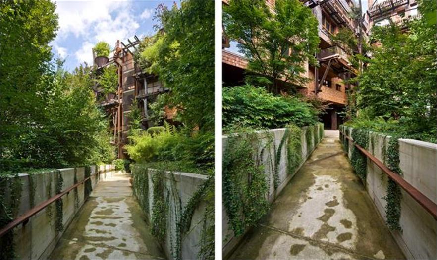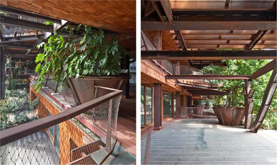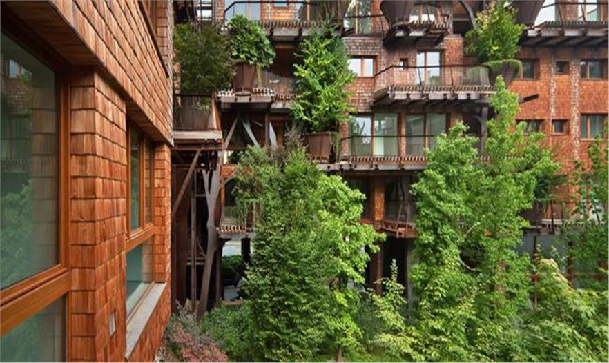 綠植是多樣化的:陽(yáng)臺(tái)上的大種植槽,庭院花園,綠植墻壁和閣樓前面的屋頂花園。