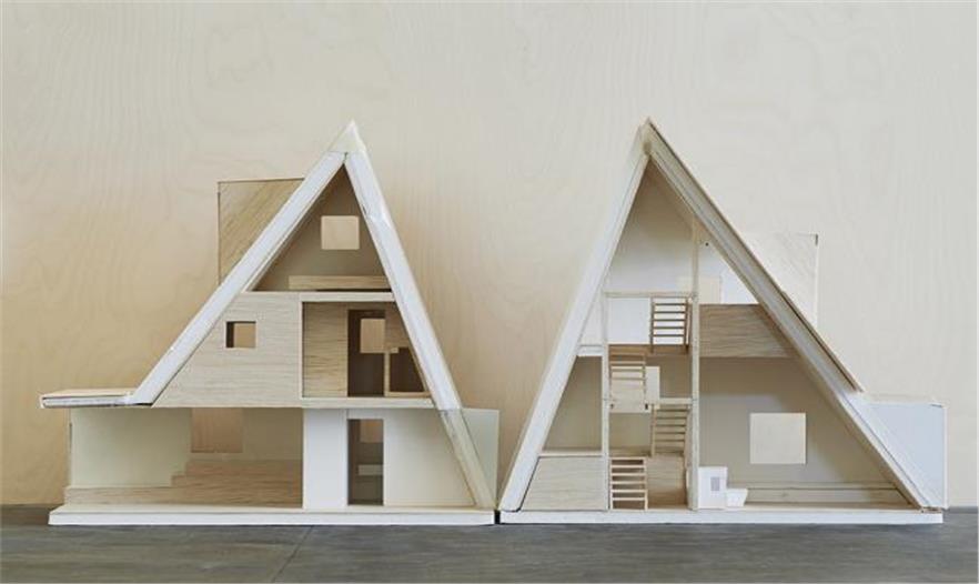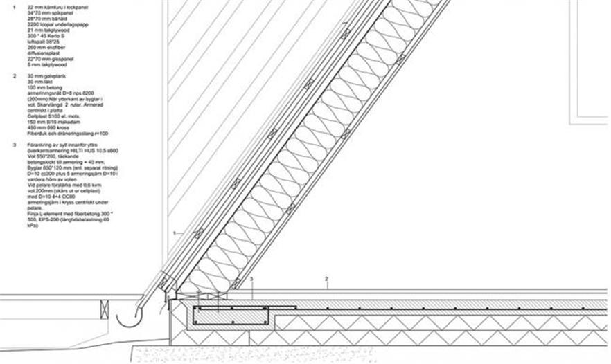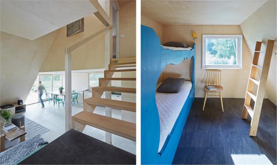 住宅從里到外都由木頭建成。屋內(nèi),天花板、墻壁和木板貼有一家關閉的木制拼圖工廠里的膠合板。門和窗戶是二手的,家具就地用膠合板制成。住宅架構由木制橫梁搭建而成,從底向頂形成一個A字形。屋頂和墻壁的材質是瑞典松樹。