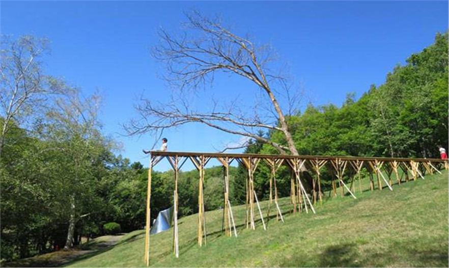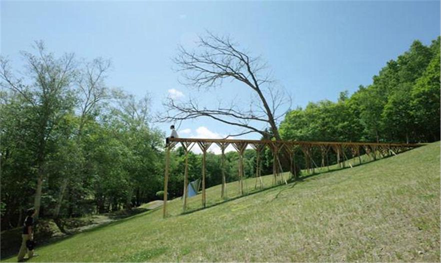 ryo yamada在日本一個小山坡上搭起了“空中花園”,這是一件代表著空中通道的藝術(shù)作品,山坡四周被美麗的自然風(fēng)光包圍。通過這件作品,yamada并不想表達通道的傳統(tǒng)含義,即連接著兩個點的一條道路,因為在這里它并沒有連接到一個可見的目的地,他希望表達出一種基于體驗的隱喻性含義。