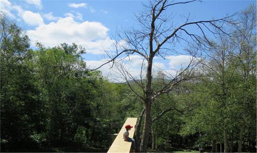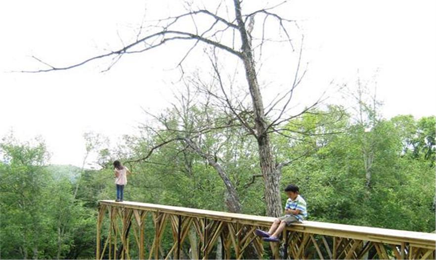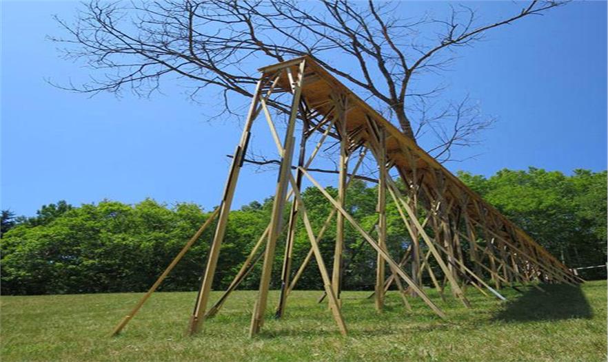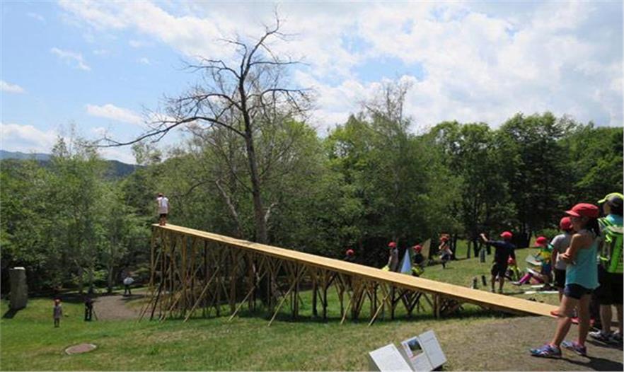 這個裝置是2014年札幌國際藝術(shù)節(jié)“萌芽公園”展覽的一部分,深究其背后的深層含義,公園這個詞的原意是指一塊封閉的、被保護的土地,在歷史上,它們是用來保護領(lǐng)主的財產(chǎn)和防止入侵者入侵的。在知道了這些信息后,藝術(shù)家就開始想象一座能夠把人們與廣闊無限的天空連接起來的空中通道,主通道有0.6米寬,足夠一個人通過。天橋的主構(gòu)架框架元素是再生木,木頭支撐著通道直入4.2米高的天空,順著山坡的趨勢木架的長度也逐漸變長。