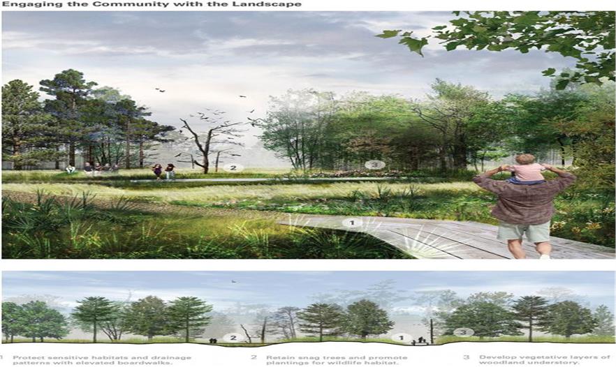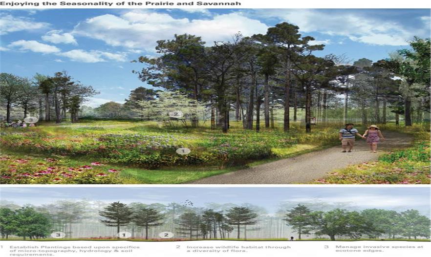 在廣受喜愛(ài)的紀(jì)念公園里的一個(gè)重要內(nèi)容,是面積155英畝的休斯頓植物園和自然中心,它被干旱和颶風(fēng)這些極端的天氣毀壞了。指導(dǎo)植物園更新設(shè)計(jì)的基本點(diǎn)在于對(duì)基地豐富的自然和文化遺產(chǎn),對(duì)氣候變化影響分析,以及對(duì)利益相關(guān)者參與度的全面評(píng)估。這個(gè)設(shè)計(jì)為植物園描繪了一個(gè)更有韌性的演變,同時(shí)對(duì)于其它具有相似情況的地區(qū)也是一個(gè)設(shè)計(jì)范本?! ?/p>